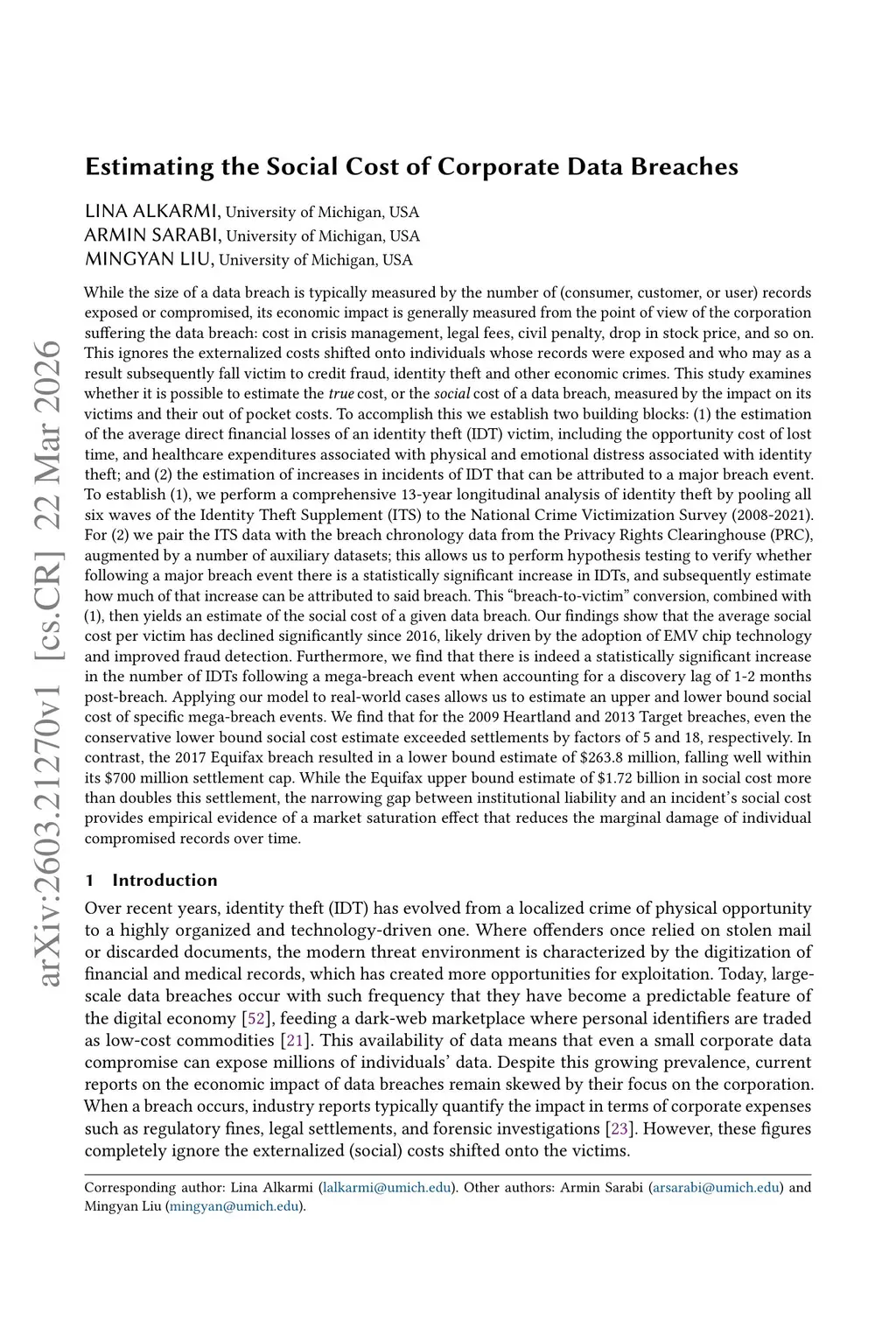 Estimating the Social Cost of Corporate Data Breaches