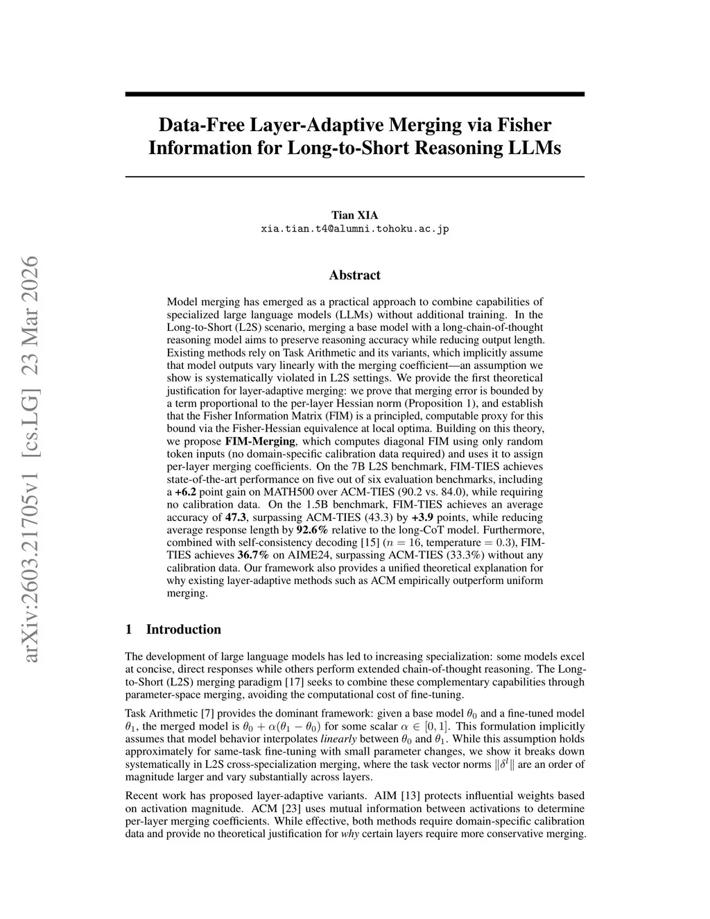 Model merging has emerged as a practical approach to combine capabilities of specialized large language models (LLMs) without additional training. In the Long-to-Short (L2S) scenario, merging a base model with a long-chain-of-thought reasoning model aims to preserve reasoning accuracy while reducing output length. Existing methods rely on Task Arithmetic and its variants, which implicitly assume that model outputs vary linearly with the merging coefficient -- an assumption we show is systematically violated in L2S settings. We provide the first theoretical justification for layer-adaptive merging: we prove that merging error is bounded by a term proportional to the per-layer Hessian norm (Proposition~1), and establish that the Fisher Information Matrix (FIM) is a principled, computable proxy for this bound via the Fisher-Hessian equivalence at local optima. Building on this theory, we propose \textbf{FIM-Merging}, which computes diagonal FIM using only random token inputs (no domain-specific calibration data required) and uses it to assign per-layer merging coefficients. On the 7B L2S benchmark, FIM-TIES achieves state-of-the-art performance on five out of six evaluation benchmarks, including a \textbf{+6.2} point gain on MATH500 over ACM-TIES (90.2 vs.\ 84.0), while requiring no calibration data. On the 1.5B benchmark, FIM-TIES achieves an average accuracy of \textbf{47.3}, surpassing the previous best ACM-TIES (43.3) by \textbf{+3.9} points, while reducing average response length by \textbf{91.9\%} relative to the long-CoT model. Our framework also provides a unified theoretical explanation for why existing layer-adaptive methods such as ACM empirically outperform uniform merging.