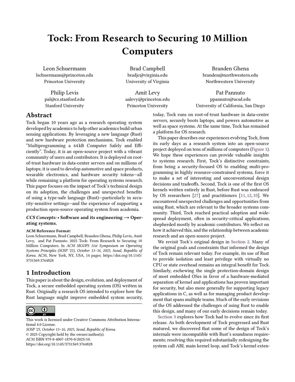 Tock began 10 years ago as a research operating system developed by academics to help other academics build urban sensing applications. By leveraging a new language (Rust) and new hardware protection mechanisms, Tock enabled Multiprogramming a 64 kB Computer Safely and Efficiently. Today, it is an open source project with a vibrant community of users and contributors. It is deployed on root of trust hardware in data center servers and on millions of laptops; it is used to develop automotive and space products, wearable electronics, and hardware security tokens--all while remaining a platform for operating systems research. This paper focuses on the impact of Tock's technical design on its adoption, the challenges and unexpected benefits of using a type safe language (Rust)--particularly in security sensitive settings--and the experience of supporting a production open4source operating system from academia.