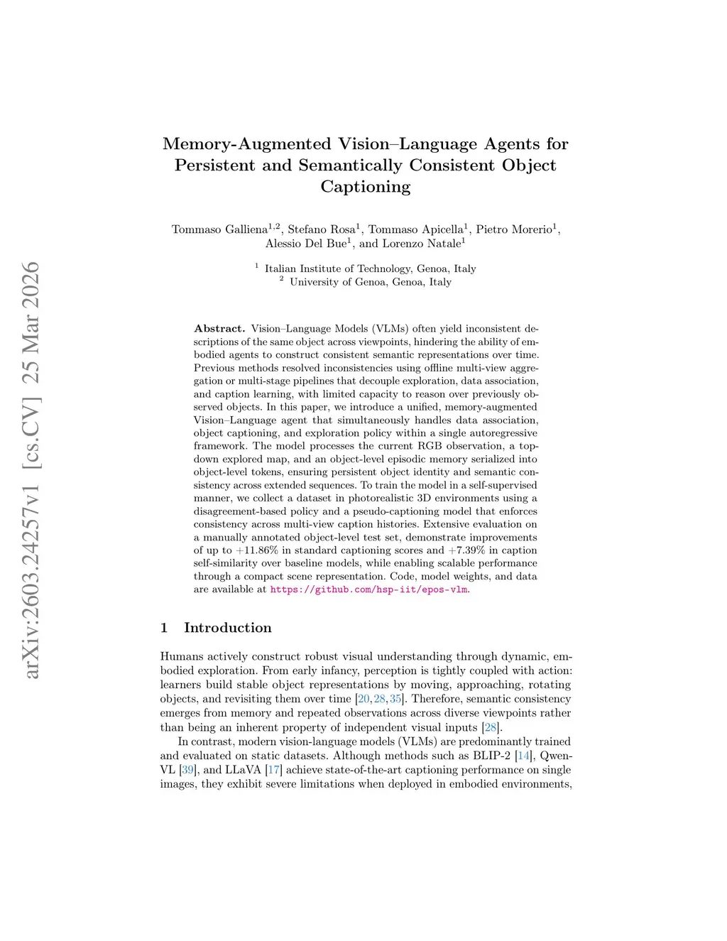 Vision-Language Models (VLMs) often yield inconsistent descriptions of the same object across viewpoints, hindering the ability of embodied agents to construct consistent semantic representations over time. Previous methods resolved inconsistencies using offline multi-view aggregation or multi-stage pipelines that decouple exploration, data association, and caption learning, with limited capacity to reason over previously observed objects. In this paper, we introduce a unified, memory-augmented Vision-Language agent that simultaneously handles data association, object captioning, and exploration policy within a single autoregressive framework. The model processes the current RGB observation, a top-down explored map, and an object-level episodic memory serialized into object-level tokens, ensuring persistent object identity and semantic consistency across extended sequences. To train the model in a self-supervised manner, we collect a dataset in photorealistic 3D environments using a disagreement-based policy and a pseudo-captioning model that enforces consistency across multi-view caption histories. Extensive evaluation on a manually annotated object-level test set, demonstrate improvements of up to +11.86% in standard captioning scores and +7.39% in caption self-similarity over baseline models, while enabling scalable performance through a compact scene representation. Code, model weights, and data are available atthis https URL.