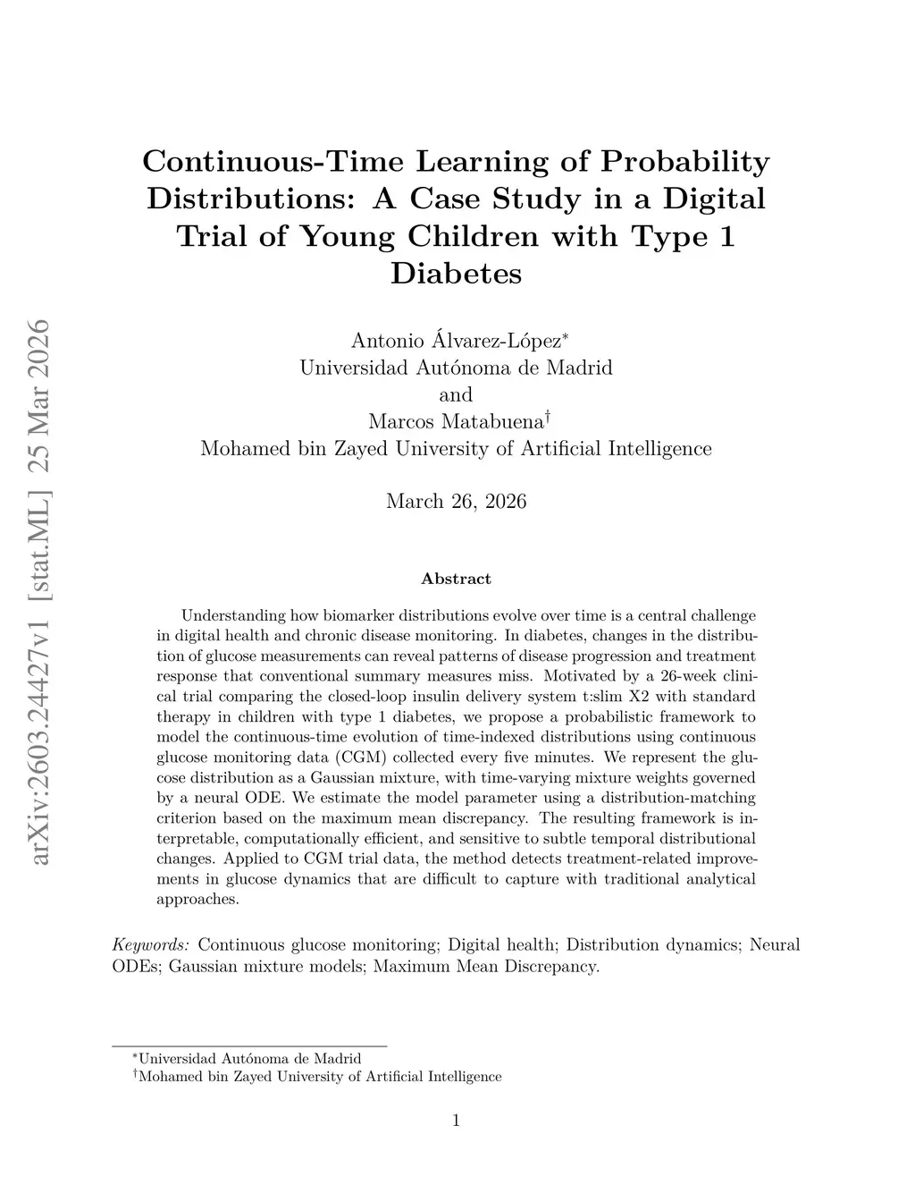 Understanding how biomarker distributions evolve over time is a central challenge in digital health and chronic disease monitoring. In diabetes, changes in the distribution of glucose measurements can reveal patterns of disease progression and treatment response that conventional summary measures miss. Motivated by a 26-week clinical trial comparing the closed-loop insulin delivery system t:slim X2 with standard therapy in children with type 1 diabetes, we propose a probabilistic framework to model the continuous-time evolution of time-indexed distributions using continuous glucose monitoring data (CGM) collected every five minutes. We represent the glucose distribution as a Gaussian mixture, with time-varying mixture weights governed by a neural ODE. We estimate the model parameter using a distribution-matching criterion based on the maximum mean discrepancy. The resulting framework is interpretable, computationally efficient, and sensitive to subtle temporal distributional changes. Applied to CGM trial data, the method detects treatment-related improvements in glucose dynamics that are difficult to capture with traditional analytical approaches.