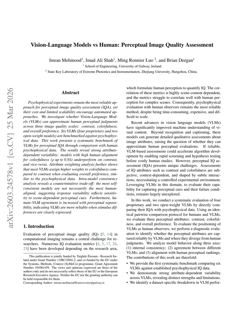 Psychophysical experiments remain the most reliable approach for perceptual image quality assessment (IQA), yet their cost and limited scalability encourage automated approaches. We investigate whether Vision Language Models (VLMs) can approximate human perceptual judgments across three image quality scales: contrast, colorfulness and overall preference. Six VLMs four proprietary and two openweight models are benchmarked against psychophysical data. This work presents a systematic benchmark of VLMs for perceptual IQA through comparison with human psychophysical data. The results reveal strong attribute dependent variability models with high human alignment for colorfulness (\rho up to 0.93) underperform on contrast and vice-versa. Attribute weighting analysis further shows that most VLMs assign higher weights to colorfulness compared to contrast when evaluating overall preference similar to the psychophysical data. Intramodel consistency analysis reveals a counterintuitive tradeoff: the most self consistent models are not necessarily the most human aligned suggesting response variability reflects sensitivity to scene dependent perceptual cues. Furthermore, human-VLM agreement is increased with perceptual separability, indicating VLMs are more reliable when stimulus differences are clearly expressed.