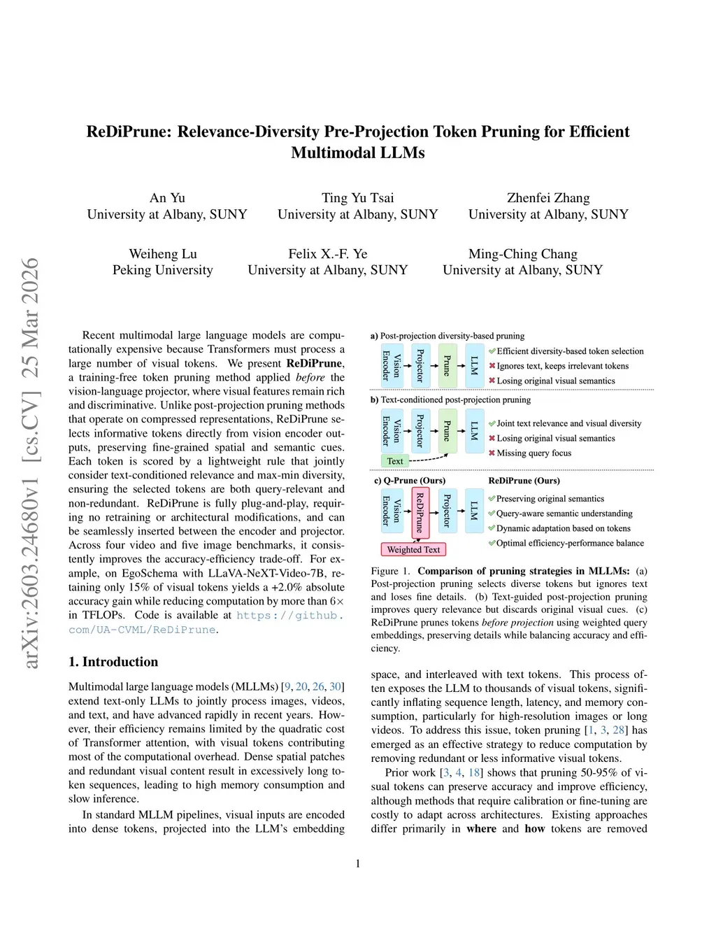 Recent multimodal large language models are computationally expensive because Transformers must process a large number of visual tokens. We present ReDiPrune, a training-free token pruning method applied before the vision-language projector, where visual features remain rich and discriminative. Unlike post-projection pruning methods that operate on compressed representations, ReDiPrune selects informative tokens directly from vision encoder outputs, preserving fine-grained spatial and semantic cues. Each token is scored by a lightweight rule that jointly consider text-conditioned relevance and max-min diversity, ensuring the selected tokens are both query-relevant and non-redundant. ReDiPrune is fully plug-and-play, requiring no retraining or architectural modifications, and can be seamlessly inserted between the encoder and projector. Across four video and five image benchmarks, it consistently improves the accuracy-efficiency trade-off. For example, on EgoSchema with LLaVA-NeXT-Video-7B, retaining only 15% of visual tokens yields a +2.0% absolute accuracy gain while reducing computation by more than in TFLOPs. Code is available atthis https URL.