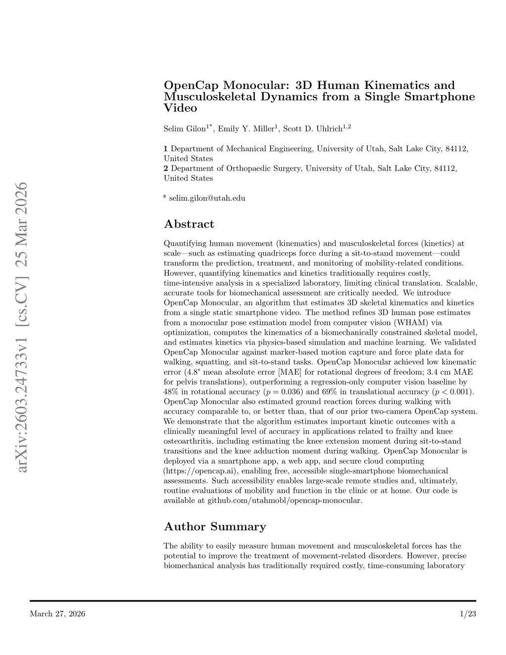 OpenCap Monocular: 3D Human Kinematics and Musculoskeletal Dynamics from a Single Smartphone Video