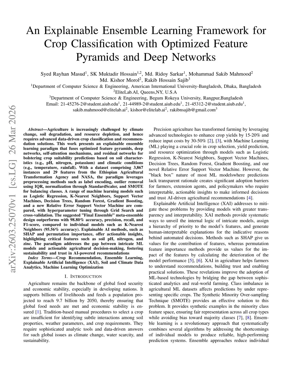 Agriculture is increasingly challenged by climate change, soil degradation, and resource depletion, and hence requires advanced data-driven crop classification and recommendation solutions. This work presents an explainable ensemble learning paradigm that fuses optimized feature pyramids, deep networks, self-attention mechanisms, and residual networks for bolstering crop suitability predictions based on soil characteristics (e.g., pH, nitrogen, potassium) and climatic conditions (e.g., temperature, rainfall). With a dataset comprising 3,867 instances and 29 features from the Ethiopian Agricultural Transformation Agency and NASA, the paradigm leverages preprocessing methods such as label encoding, outlier removal using IQR, normalization through StandardScaler, and SMOTE for balancing classes. A range of machine learning models such as Logistic Regression, K-Nearest Neighbors, Support Vector Machines, Decision Trees, Random Forest, Gradient Boosting, and a new Relative Error Support Vector Machine are compared, with hyperparameter tuning through Grid Search and cross-validation. The suggested "Final Ensemble" meta-ensemble design outperforms with 98.80% accuracy, precision, recall, and F1-score, compared to individual models such as K-Nearest Neighbors (95.56% accuracy). Explainable AI methods, such as SHAP and permutation importance, offer actionable insights, highlighting critical features such as soil pH, nitrogen, and zinc. The paradigm addresses the gap between intricate ML models and actionable agricultural decision-making, fostering sustainability and trust in AI-powered recommendations