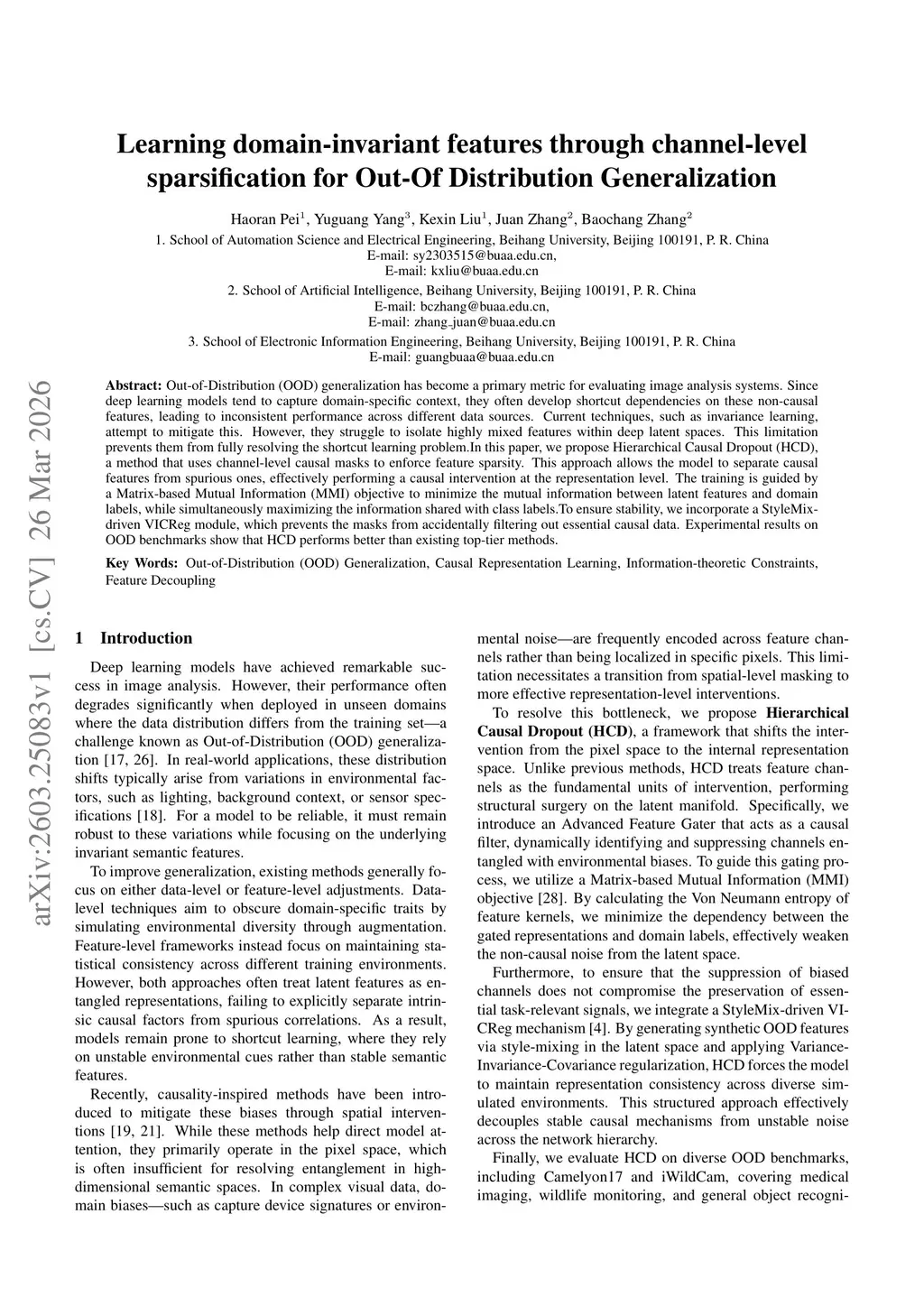 Out-of-Distribution (OOD) generalization has become a primary metric for evaluating image analysis systems. Since deep learning models tend to capture domain-specific context, they often develop shortcut dependencies on these non-causal features, leading to inconsistent performance across different data sources. Current techniques, such as invariance learning, attempt to mitigate this. However, they struggle to isolate highly mixed features within deep latent spaces. This limitation prevents them from fully resolving the shortcut learningthis http URLthis paper, we propose Hierarchical Causal Dropout (HCD), a method that uses channel-level causal masks to enforce feature sparsity. This approach allows the model to separate causal features from spurious ones, effectively performing a causal intervention at the representation level. The training is guided by a Matrix-based Mutual Information (MMI) objective to minimize the mutual information between latent features and domain labels, while simultaneously maximizing the information shared with classthis http URLensure stability, we incorporate a StyleMix-driven VICReg module, which prevents the masks from accidentally filtering out essential causal data. Experimental results on OOD benchmarks show that HCD performs better than existing top-tier methods.