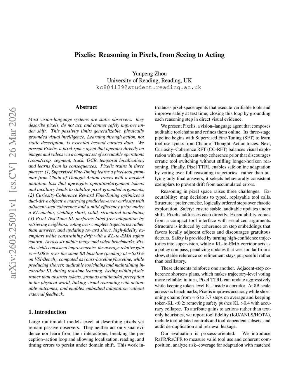 Most vision-language systems are static observers: they describe pixels, do not act, and cannot safely improve under shift. This passivity limits generalizable, physically grounded visual intelligence. Learning through action, not static description, is essential beyond curated data. We present Pixelis, a pixel-space agent that operates directly on images and videos via a compact set of executable operations (zoom/crop, segment, track, OCR, temporal localization) and learns from its consequences. Pixelis trains in three phases: (1) Supervised Fine-Tuning learns a pixel-tool grammar from Chain-of-Thought-Action traces with a masked imitation loss that upweights operation/argument tokens and auxiliary heads to stabilize pixel-grounded arguments; (2) Curiosity-Coherence Reward Fine-Tuning optimizes a dual-drive objective marrying prediction-error curiosity with adjacent-step coherence and a mild efficiency prior under a KL anchor, yielding short, valid, structured toolchains; (3) Pixel Test-Time RL performs label-free adaptation by retrieving neighbors, voting over complete trajectories rather than answers, and updating toward short, high-fidelity exemplars while constraining drift with a KL-to-EMA safety control. Across six public image and video benchmarks, Pixelis yields consistent improvements: the average relative gain is +4.08% over the same 8B baseline (peaking at +6.03% on VSI-Bench), computed as (ours-baseline)/baseline, while producing shorter, auditable toolchains and maintaining in-corridor KL during test-time learning. Acting within pixels, rather than abstract tokens, grounds multimodal perception in the physical world, linking visual reasoning with actionable outcomes, and enables embodied adaptation without external feedback.