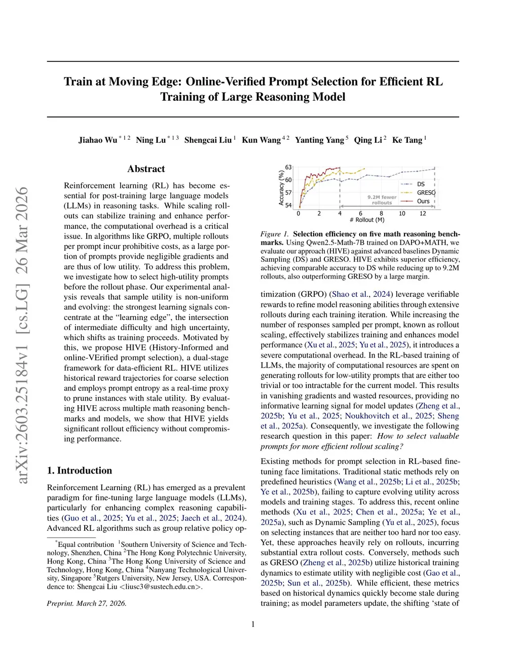Reinforcement learning (RL) has become essential for post-training large language models (LLMs) in reasoning tasks. While scaling rollouts can stabilize training and enhance performance, the computational overhead is a critical issue. In algorithms like GRPO, multiple rollouts per prompt incur prohibitive costs, as a large portion of prompts provide negligible gradients and are thus of low utility. To address this problem, we investigate how to select high-utility prompts before the rollout phase. Our experimental analysis reveals that sample utility is non-uniform and evolving: the strongest learning signals concentrate at the ``learning edge", the intersection of intermediate difficulty and high uncertainty, which shifts as training proceeds. Motivated by this, we propose HIVE (History-Informed and online-VErified prompt selection), a dual-stage framework for data-efficient RL. HIVE utilizes historical reward trajectories for coarse selection and employs prompt entropy as a real-time proxy to prune instances with stale utility. By evaluating HIVE across multiple math reasoning benchmarks and models, we show that HIVE yields significant rollout efficiency without compromising performance.