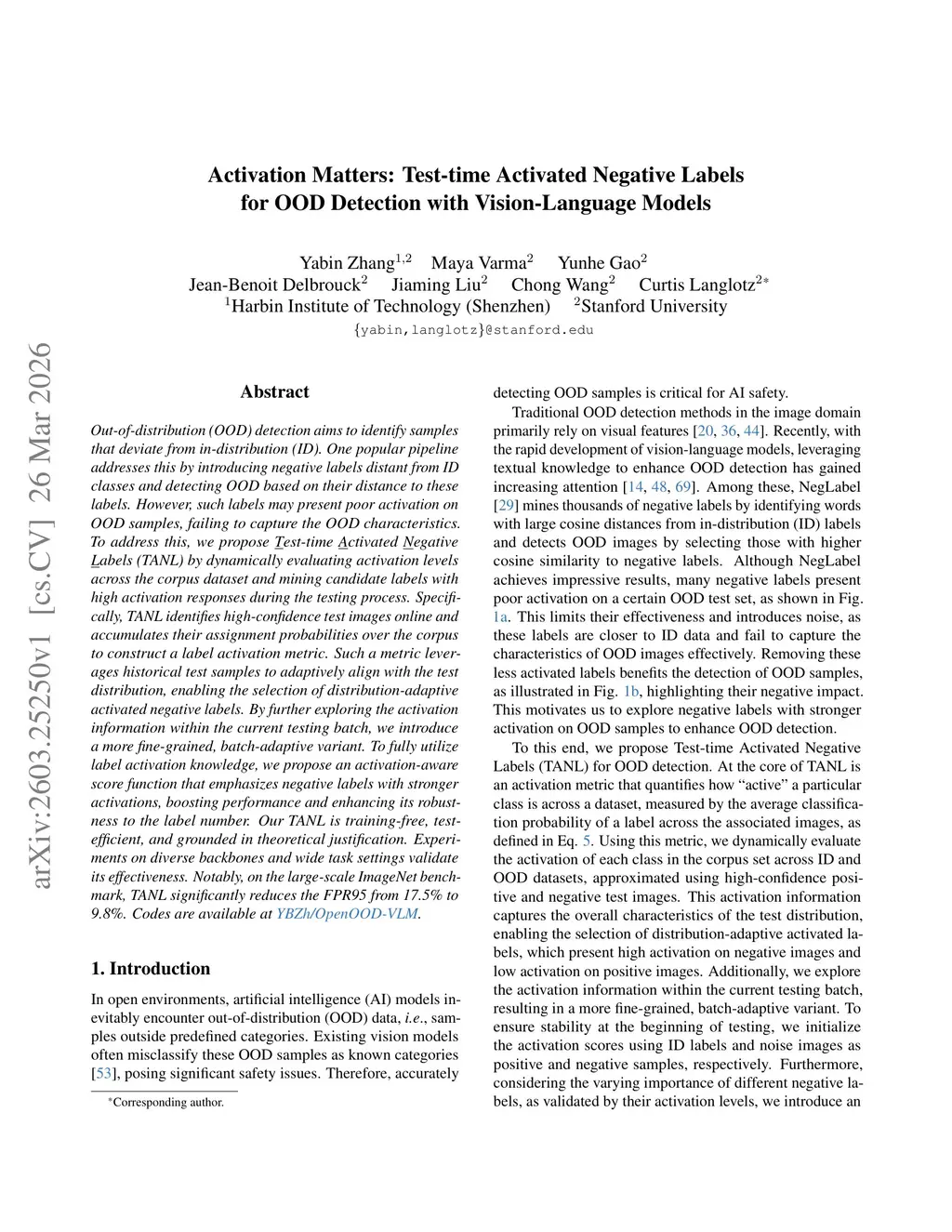 Activation Matters: Test-time Activated Negative Labels for OOD Detection with Vision-Language Models