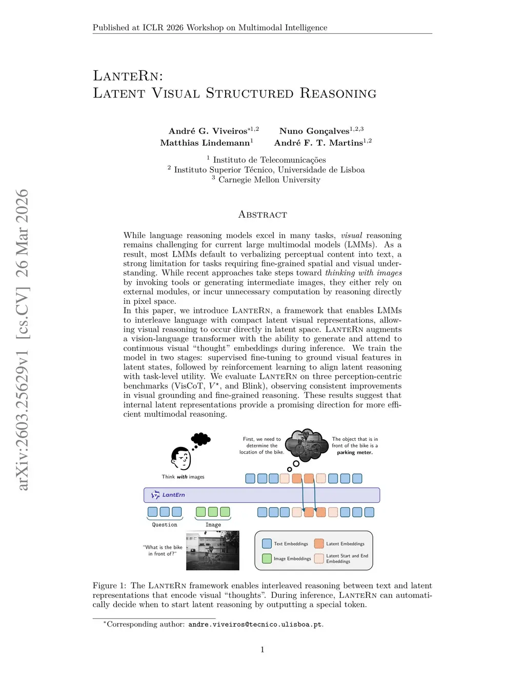 While language reasoning models excel in many tasks, visual reasoning remains challenging for current large multimodal models (LMMs). As a result, most LMMs default to verbalizing perceptual content into text, a strong limitation for tasks requiring fine-grained spatial and visual understanding. While recent approaches take steps toward thinking with images by invoking tools or generating intermediate images, they either rely on external modules, or incur unnecessary computation by reasoning directly in pixel space. In this paper, we introduce LanteRn, a framework that enables LMMs to interleave language with compact latent visual representations, allowing visual reasoning to occur directly in latent space. LanteRn augments a vision-language transformer with the ability to generate and attend to continuous visual thought embeddings during inference. We train the model in two stages: supervised fine-tuning to ground visual features in latent states, followed by reinforcement learning to align latent reasoning with task-level utility. We evaluate LanteRn on three perception-centric benchmarks (VisCoT, V*, and Blink), observing consistent improvements in visual grounding and fine-grained reasoning. These results suggest that internal latent representations provide a promising direction for more efficient multimodal reasoning.
