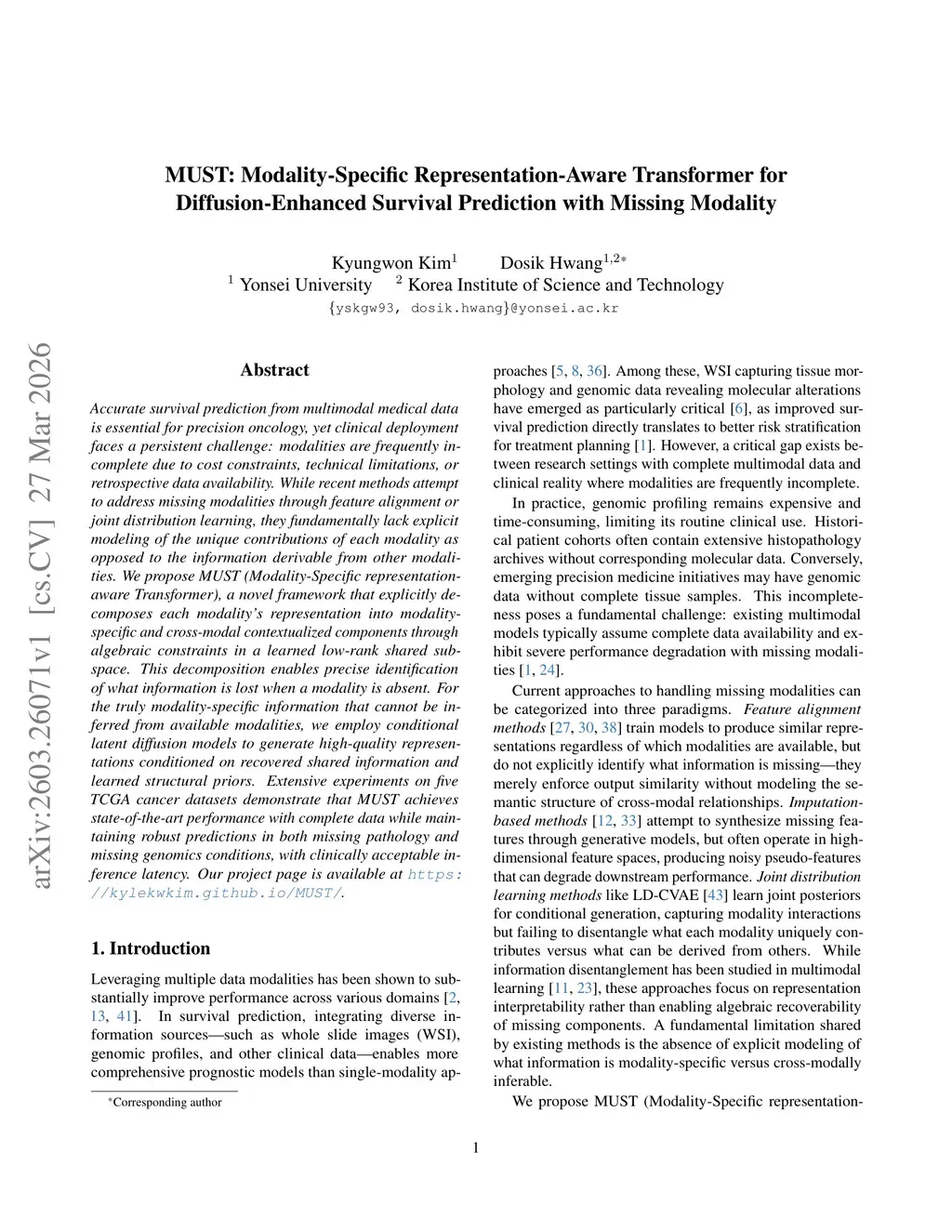 MUST: Modality-Specific Representation-Aware Transformer for Diffusion-Enhanced Survival Prediction with Missing Modality