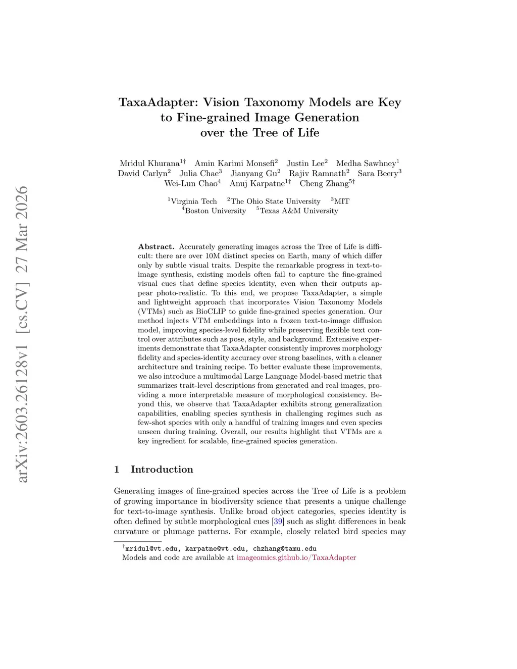 Accurately generating images across the Tree of Life is difficult: there are over 10M distinct species on Earth, many of which differ only by subtle visual traits. Despite the remarkable progress in text-to-image synthesis, existing models often fail to capture the fine-grained visual cues that define species identity, even when their outputs appear photo-realistic. To this end, we propose TaxaAdapter, a simple and lightweight approach that incorporates Vision Taxonomy Models (VTMs) such as BioCLIP to guide fine-grained species generation. Our method injects VTM embeddings into a frozen text-to-image diffusion model, improving species-level fidelity while preserving flexible text control over attributes such as pose, style, and background. Extensive experiments demonstrate that TaxaAdapter consistently improves morphology fidelity and species-identity accuracy over strong baselines, with a cleaner architecture and training recipe. To better evaluate these improvements, we also introduce a multimodal Large Language Model-based metric that summarizes trait-level descriptions from generated and real images, providing a more interpretable measure of morphological consistency. Beyond this, we observe that TaxaAdapter exhibits strong generalization capabilities, enabling species synthesis in challenging regimes such as few-shot species with only a handful of training images and even species unseen during training. Overall, our results highlight that VTMs are a key ingredient for scalable, fine-grained species generation.