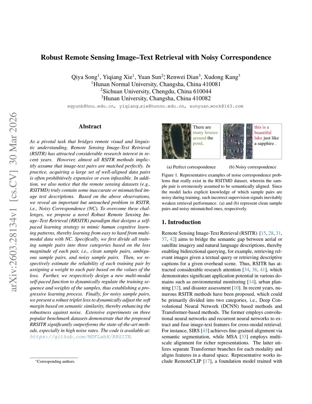 As a pivotal task that bridges remote visual and linguistic understanding, Remote Sensing Image-Text Retrieval (RSITR) has attracted considerable research interest in recent years. However, almost all RSITR methods implicitly assume that image-text pairs are matched perfectly. In practice, acquiring a large set of well-aligned data pairs is often prohibitively expensive or even infeasible. In addition, we also notice that the remote sensing datasets (e.g., RSITMD) truly contain some inaccurate or mismatched image text descriptions. Based on the above observations, we reveal an important but untouched problem in RSITR, i.e., Noisy Correspondence (NC). To overcome these challenges, we propose a novel Robust Remote Sensing Image-Text Retrieval (RRSITR) paradigm that designs a self-paced learning strategy to mimic human cognitive learning patterns, thereby learning from easy to hard from multi-modal data with NC. Specifically, we first divide all training sample pairs into three categories based on the loss magnitude of each pair, i.e., clean sample pairs, ambiguous sample pairs, and noisy sample pairs. Then, we respectively estimate the reliability of each training pair by assigning a weight to each pair based on the values of the loss. Further, we respectively design a new multi-modal self-paced function to dynamically regulate the training sequence and weights of the samples, thus establishing a progressive learning process. Finally, for noisy sample pairs, we present a robust triplet loss to dynamically adjust the soft margin based on semantic similarity, thereby enhancing the robustness against noise. Extensive experiments on three popular benchmark datasets demonstrate that the proposed RRSITR significantly outperforms the state-of-the-art methods, especially in high noise rates. The code is available at:this https URL