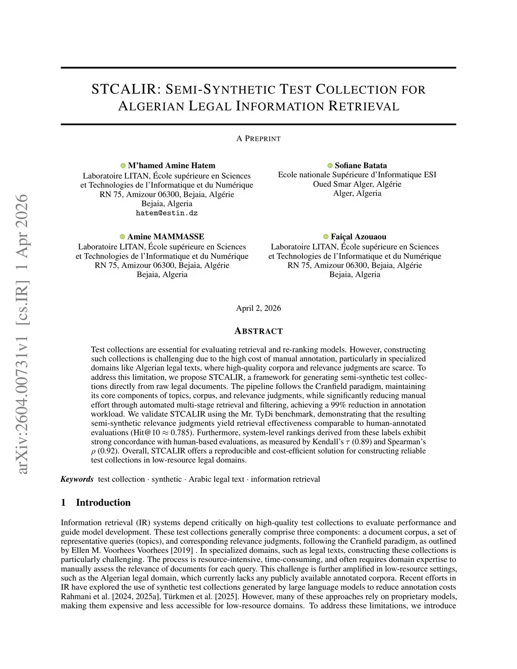 STCALIR: Semi-Synthetic Test Collection for Algerian Legal Information Retrieval