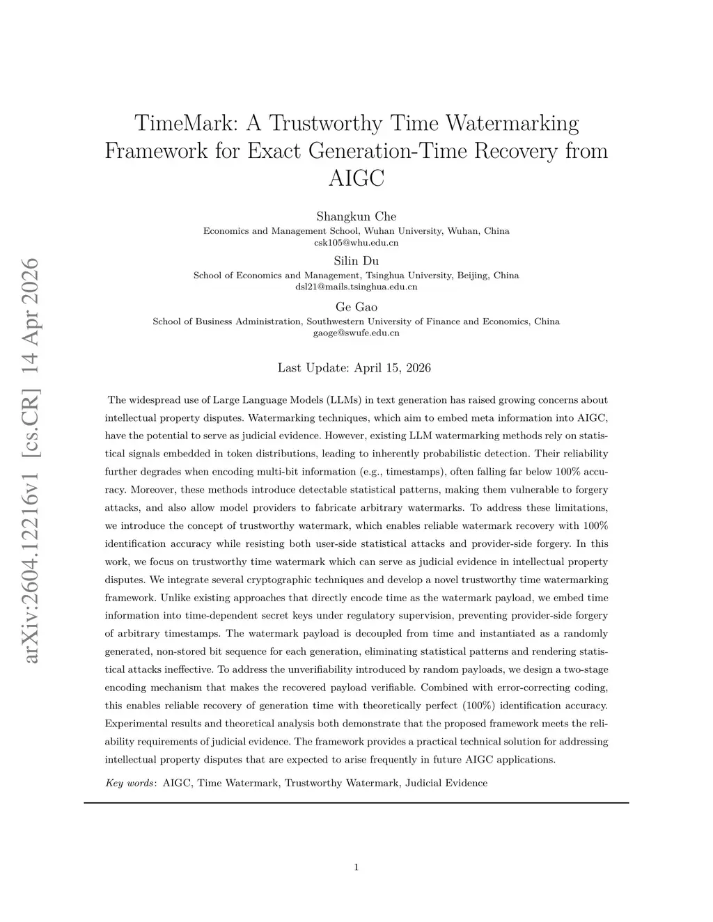 The widespread use of Large Language Models (LLMs) in text generation has raised increasing concerns about intellectual property disputes. Watermarking techniques, which embed meta information into AI-generated content (AIGC), have the potential to serve as judicial evidence. However, existing methods rely on statistical signals in token distributions, leading to inherently probabilistic detection and reduced reliability, especially in multi-bit encoding (e.g., timestamps). Moreover, such methods introduce detectable statistical patterns, making them vulnerable to forgery attacks and enabling model providers to fabricate arbitrary watermarks. To address these issues, we propose the concept of trustworthy watermark, which achieves reliable recovery with 100% identification accuracy while resisting both user-side statistical attacks and provider-side forgery. We focus on trustworthy time watermarking for use as judicial evidence. Our framework integrates cryptographic techniques and encodes time information into time-dependent secret keys under regulatory supervision, preventing arbitrary timestamp fabrication. The watermark payload is decoupled from time and generated as a random, non-stored bit sequence for each instance, eliminating statistical patterns. To ensure verifiability, we design a two-stage encoding mechanism, which, combined with error-correcting codes, enables reliable recovery of generation time with theoretically perfect accuracy. Both theoretical analysis and experiments demonstrate that our framework satisfies the reliability requirements for judicial evidence and offers a practical solution for future AIGC-related intellectual property disputes.