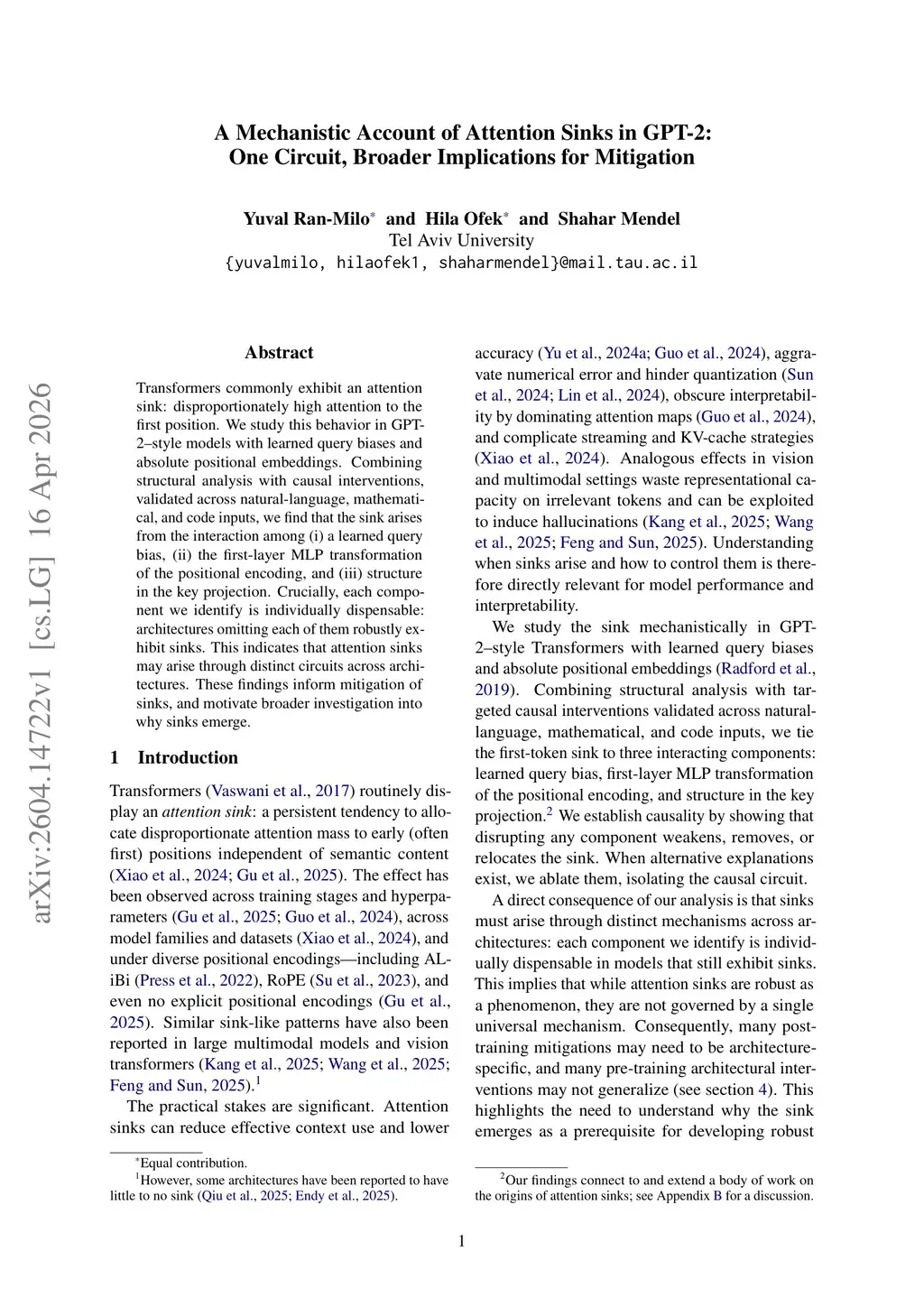Transformers commonly exhibit an attention sink: disproportionately high attention to the first position. We study this behavior in GPT-2-style models with learned query biases and absolute positional embeddings. Combining structural analysis with causal interventions, validated across natural-language, mathematical, and code inputs, we find that the sink arises from the interaction among (i) a learned query bias, (ii) the first-layer MLP transformation of the positional encoding, and (iii) structure in the key projection. Crucially, each component we identify is individually dispensable: architectures omitting each of them robustly exhibit sinks. This indicates that attention sinks may arise through distinct circuits across architectures. These findings inform mitigation of sinks, and motivate broader investigation into why sinks emerge.