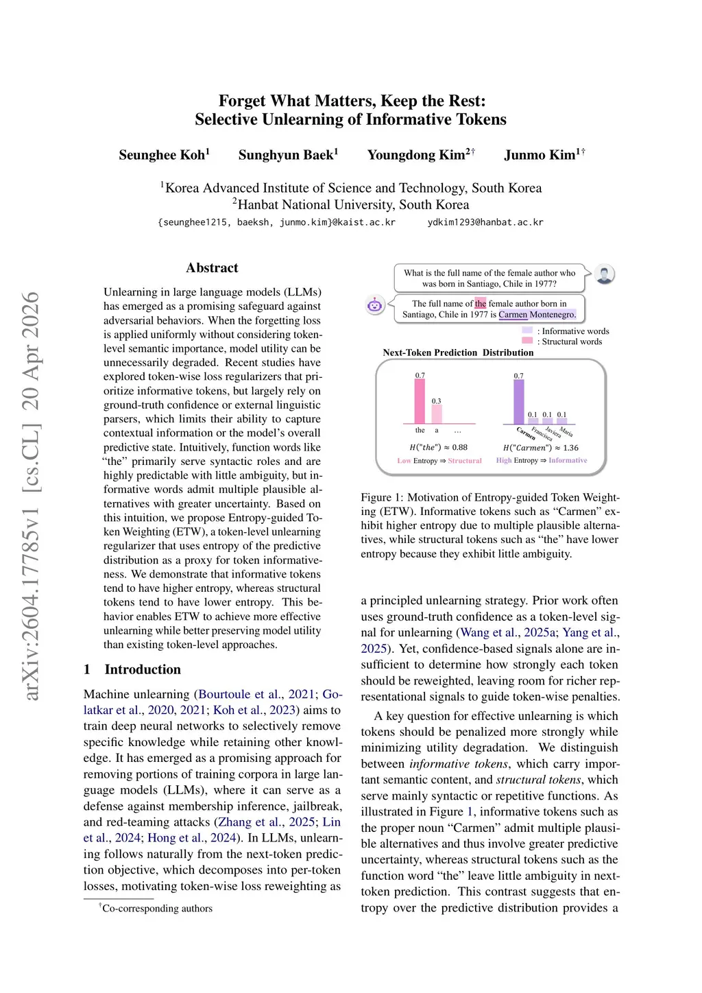 Unlearning in large language models (LLMs) has emerged as a promising safeguard against adversarial behaviors. When the forgetting loss is applied uniformly without considering token-level semantic importance, model utility can be unnecessarily degraded. Recent studies have explored token-wise loss regularizers that prioritize informative tokens, but largely rely on ground-truth confidence or external linguistic parsers, which limits their ability to capture contextual information or the model's overall predictive state. Intuitively, function words like "the" primarily serve syntactic roles and are highly predictable with little ambiguity, but informative words admit multiple plausible alternatives with greater uncertainty. Based on this intuition, we propose Entropy-guided Token Weighting (ETW), a token-level unlearning regularizer that uses entropy of the predictive distribution as a proxy for token informativeness. We demonstrate that informative tokens tend to have higher entropy, whereas structural tokens tend to have lower entropy. This behavior enables ETW to achieve more effective unlearning while better preserving model utility than existing token-level approaches.
