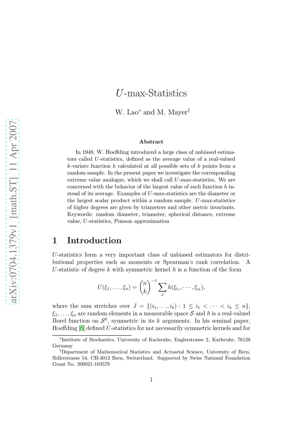 In 1948, W. Hoeffding introduced a large class of unbiased estimators called U-statistics, defined as the average value of a real-valued k-variate function h calculated at all possible sets of k points from a random sample. In the present paper we investigate the corresponding extreme value analogue, which we shall call U-max-statistics. We are concerned with the behavior of the largest value of such function h instead of its average. Examples of U-max-statistics are the diameter or the largest scalar product within a random sample. U-max-statistics of higher degrees are given by triameters and other metric invariants.