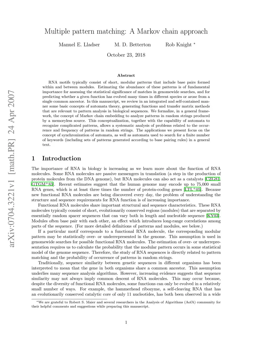 RNA motifs typically consist of short, modular patterns that include base pairs formed within and between modules. Estimating the abundance of these patterns is of fundamental importance for assessing the statistical significance of matches in genomewide searches, and for predicting whether a given function has evolved many times in different species or arose from a single common ancestor. In this manuscript, we review in an integrated and self-contained manner some basic concepts of automata theory, generating functions and transfer matrix methods that are relevant to pattern analysis in biological sequences. We formalize, in a general framework, the concept of Markov chain embedding to analyze patterns in random strings produced by a memoryless source. This conceptualization, together with the capability of automata to recognize complicated patterns, allows a systematic analysis of problems related to the occurrence and frequency of patterns in random strings. The applications we present focus on the concept of synchronization of automata, as well as automata used to search for a finite number of keywords (including sets of patterns generated according to base pairing rules) in a general text.