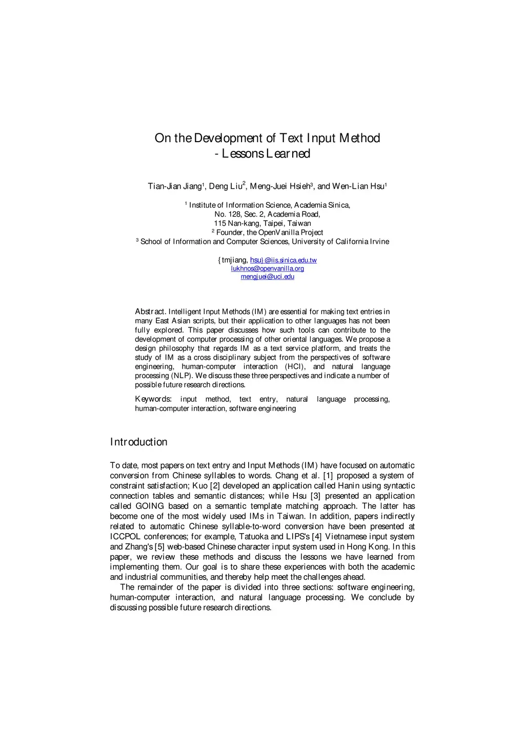 Intelligent Input Methods (IM) are essential for making text entries in many East Asian scripts, but their application to other languages has not been fully explored. This paper discusses how such tools can contribute to the development of computer processing of other oriental languages. We propose a design philosophy that regards IM as a text service platform, and treats the study of IM as a cross disciplinary subject from the perspectives of software engineering, human-computer interaction (HCI), and natural language processing (NLP). We discuss these three perspectives and indicate a number of possible future research directions.