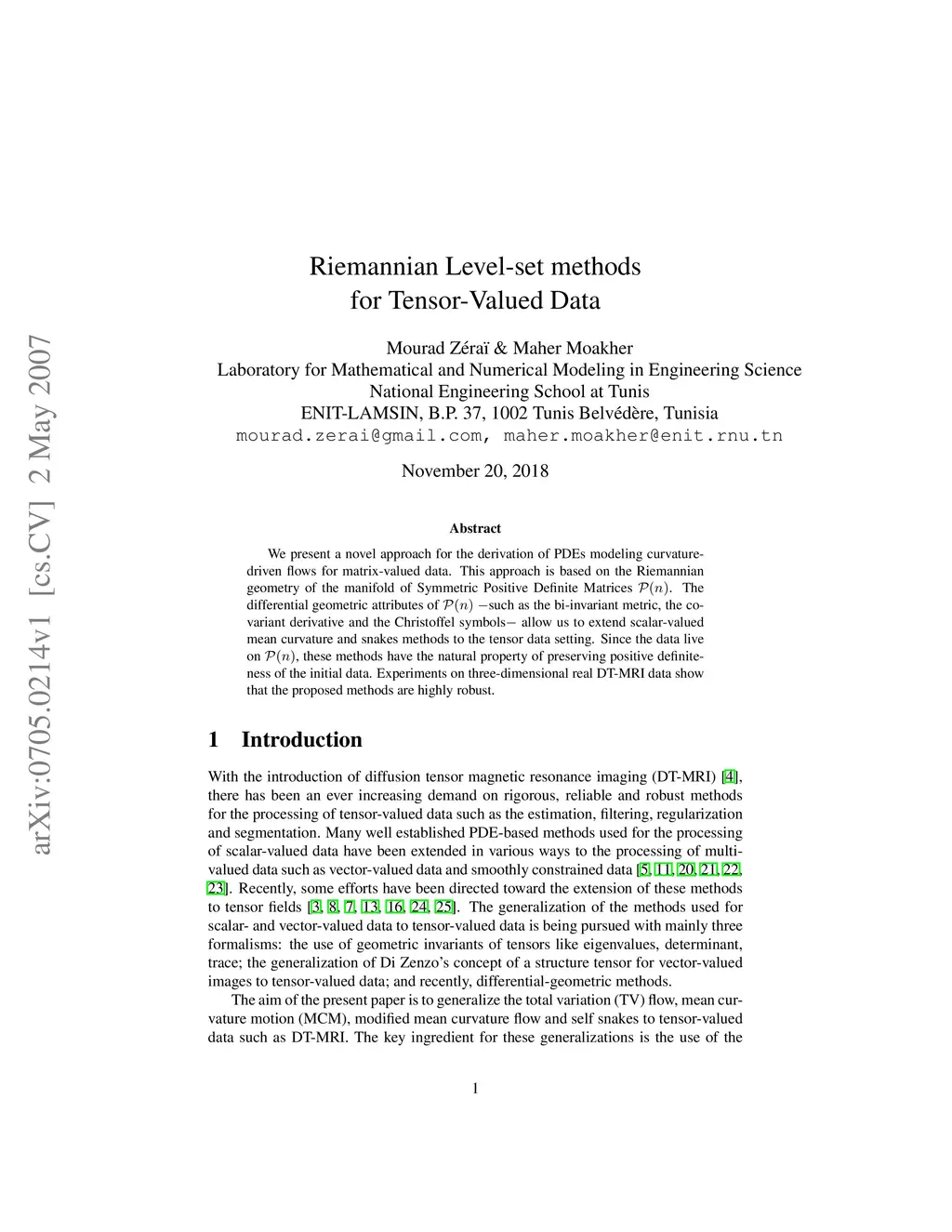 We present a novel approach for the derivation of PDE modeling curvature-driven flows for matrix-valued data. This approach is based on the Riemannian geometry of the manifold of Symmetric Positive Definite Matrices Pos(n).