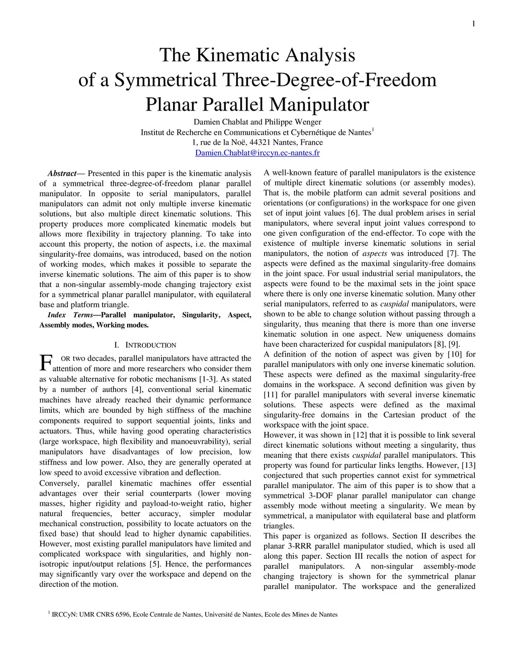 The Kinematic Analysis of a Symmetrical Three-Degree-of-Freedom Planar
