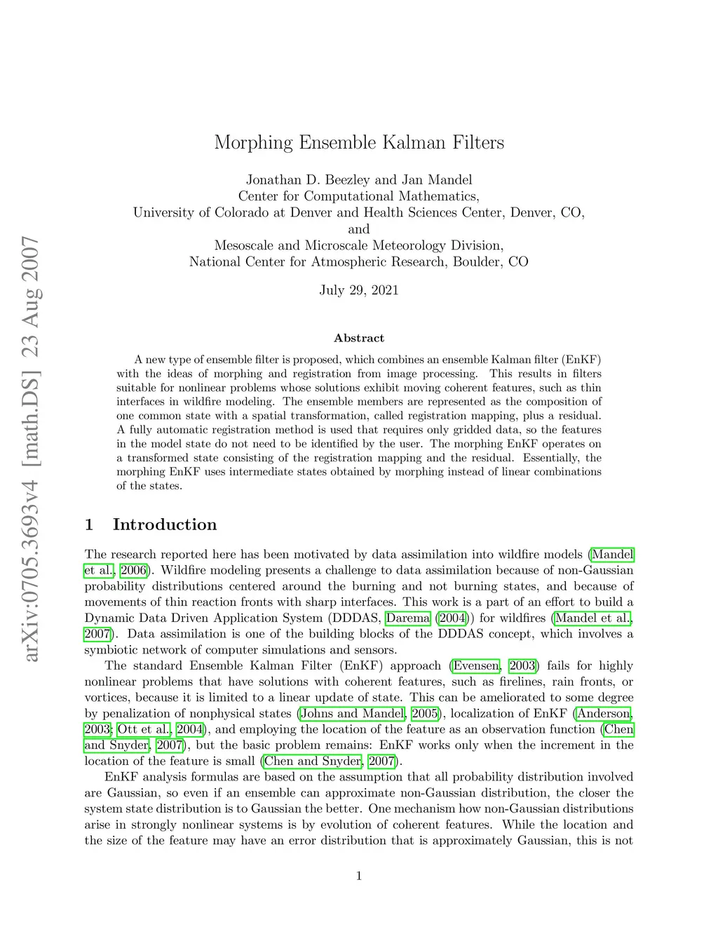 A new type of ensemble filter is proposed, which combines an ensemble Kalman filter (EnKF) with the ideas of morphing and registration from image processing. This results in filters suitable for nonlinear problems whose solutions exhibit moving coherent features, such as thin interfaces in wildfire modeling. The ensemble members are represented as the composition of one common state with a spatial transformation, called registration mapping, plus a residual. A fully automatic registration method is used that requires only gridded data, so the features in the model state do not need to be identified by the user. The morphing EnKF operates on a transformed state consisting of the registration mapping and the residual. Essentially, the morphing EnKF uses intermediate states obtained by morphing instead of linear combinations of the states.