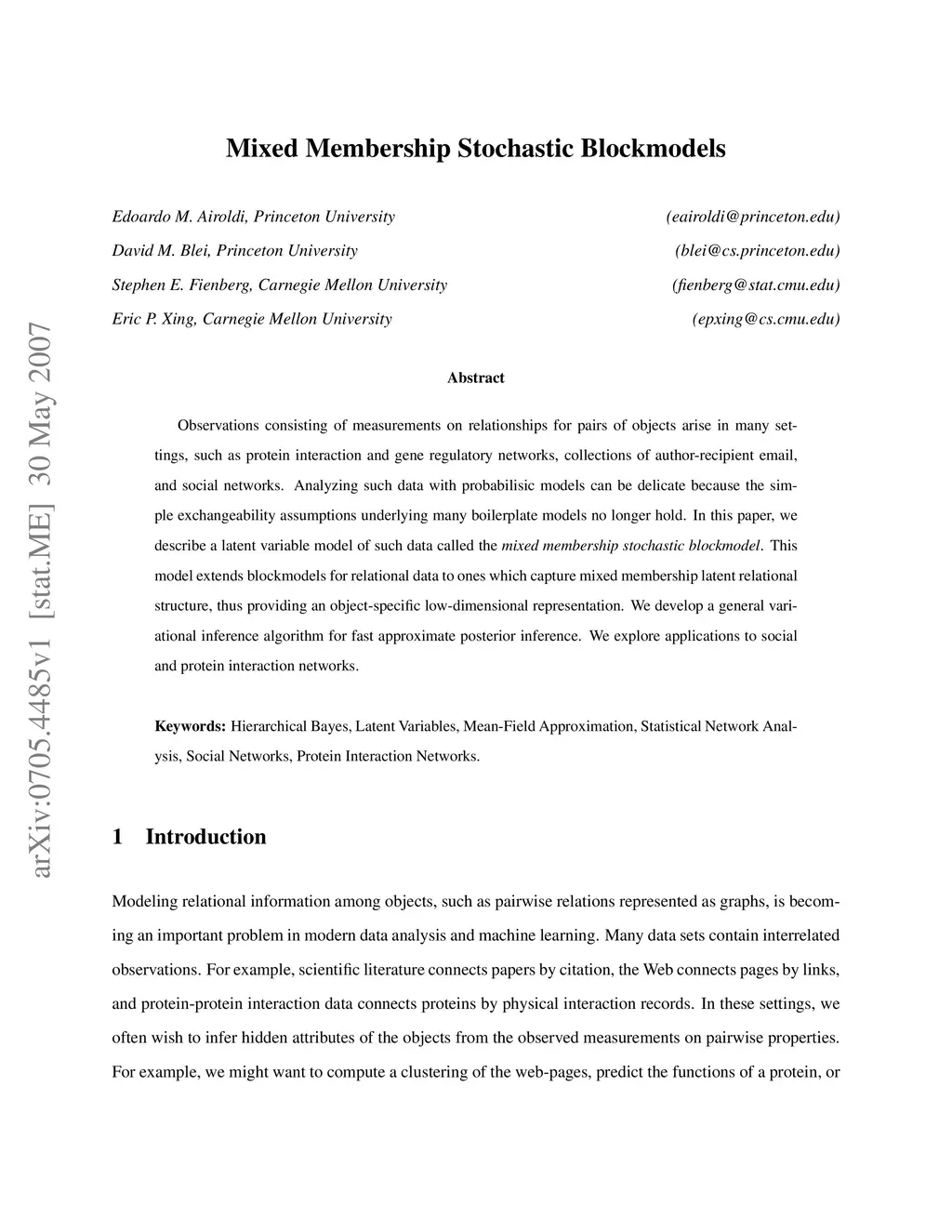 Observations consisting of measurements on relationships for pairs of objects arise in many settings, such as protein interaction and gene regulatory networks, collections of author-recipient email, and social networks. Analyzing such data with probabilisic models can be delicate because the simple exchangeability assumptions underlying many boilerplate models no longer hold. In this paper, we describe a latent variable model of such data called the mixed membership stochastic blockmodel. This model extends blockmodels for relational data to ones which capture mixed membership latent relational structure, thus providing an object-specific low-dimensional representation. We develop a general variational inference algorithm for fast approximate posterior inference. We explore applications to social and protein interaction networks.