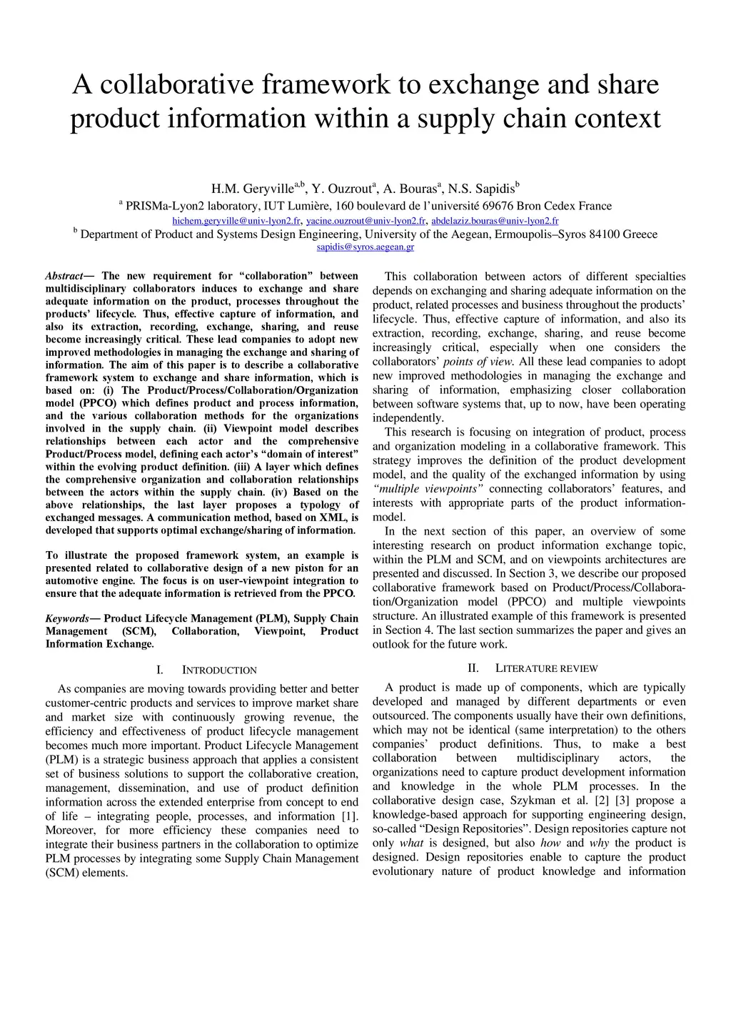 The new requirement for "collaboration" between multidisciplinary collaborators induces to exchange and share adequate information on the product, processes throughout the products' lifecycle. Thus, effective capture of information, and also its extraction, recording, exchange, sharing, and reuse become increasingly critical. These lead companies to adopt new improved methodologies in managing the exchange and sharing of information. The aim of this paper is to describe a collaborative framework system to exchange and share information, which is based on: (i) The Product Process Collaboration Organization model (PPCO) which defines product and process information, and the various collaboration methods for the organizations involved in the supply chain. (ii) Viewpoint model describes relationships between each actor and the comprehensive Product/Process model, defining each actor's "domain of interest" within the evolving product definition. (iii) A layer which defines the comprehensive organization and collaboration relationships between the actors within the supply chain. (iv) Based on the above relationships, the last layer proposes a typology of exchanged messages. A communication method, based on XML, is developed that supports optimal exchange/sharing of information. To illustrate the proposed framework system, an example is presented related to collaborative design of a new piston for an automotive engine. The focus is on user-viewpoint integration to ensure that the adequate information is retrieved from the PPCO.