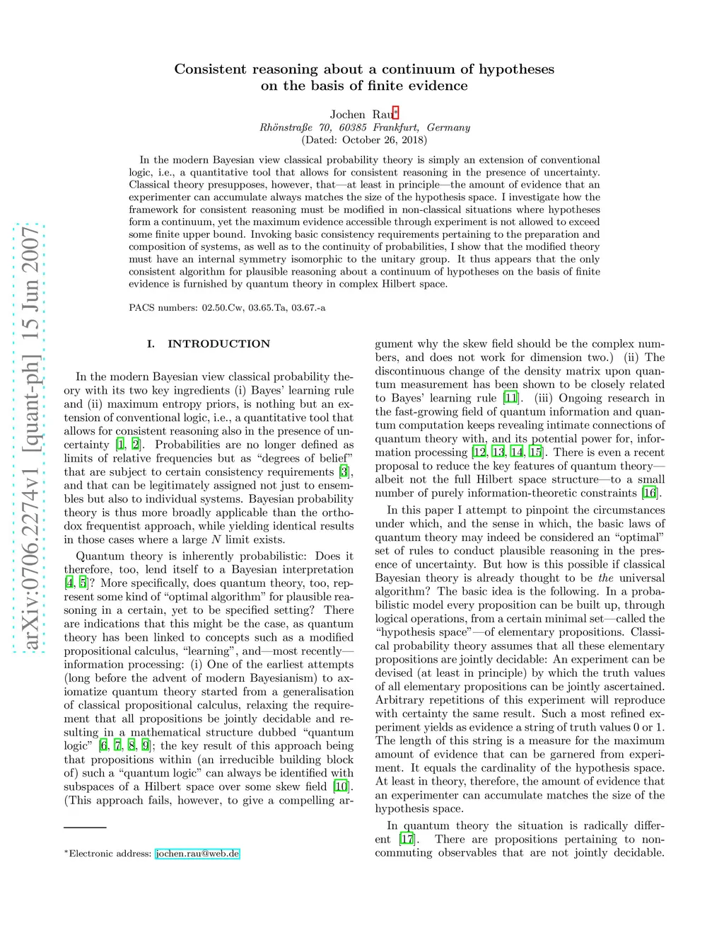 In the modern Bayesian view classical probability theory is simply an extension of conventional logic, i.e., a quantitative tool that allows for consistent reasoning in the presence of uncertainty. Classical theory presupposes, however, that--at least in principle--the amount of evidence that an experimenter can accumulate always matches the size of the hypothesis space. I investigate how the framework for consistent reasoning must be modified in non-classical situations where hypotheses form a continuum, yet the maximum evidence accessible through experiment is not allowed to exceed some finite upper bound. Invoking basic consistency requirements pertaining to the preparation and composition of systems, as well as to the continuity of probabilities, I show that the modified theory must have an internal symmetry isomorphic to the unitary group. It thus appears that the only consistent algorithm for plausible reasoning about a continuum of hypotheses on the basis of finite evidence is furnished by quantum theory in complex Hilbert space.