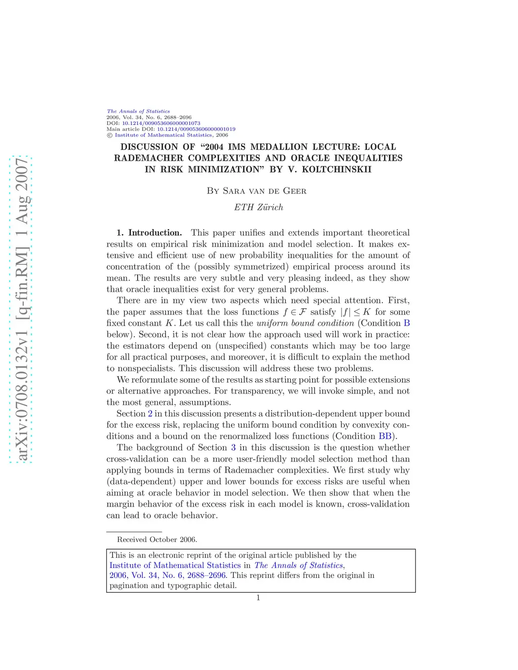 Discussion of ``2004 IMS Medallion Lecture: Local Rademacher complexities and oracle inequalities in risk minimization'' by V. Koltchinskii [arXiv:0708.0083]