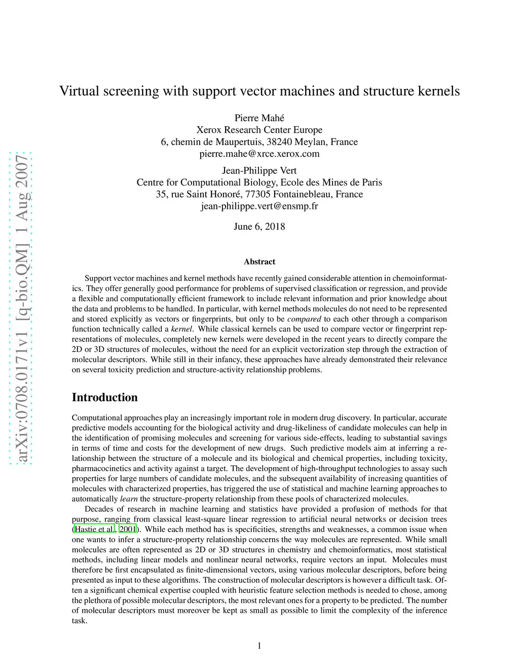 Support vector machines and kernel methods have recently gained considerable attention in chemoinformatics. They offer generally good performance for problems of supervised classification or regression, and provide a flexible and computationally efficient framework to include relevant information and prior knowledge about the data and problems to be handled. In particular, with kernel methods molecules do not need to be represented and stored explicitly as vectors or fingerprints, but only to be compared to each other through a comparison function technically called a kernel. While classical kernels can be used to compare vector or fingerprint representations of molecules, completely new kernels were developed in the recent years to directly compare the 2D or 3D structures of molecules, without the need for an explicit vectorization step through the extraction of molecular descriptors. While still in their infancy, these approaches have already demonstrated their relevance on several toxicity prediction and structure-activity relationship problems.