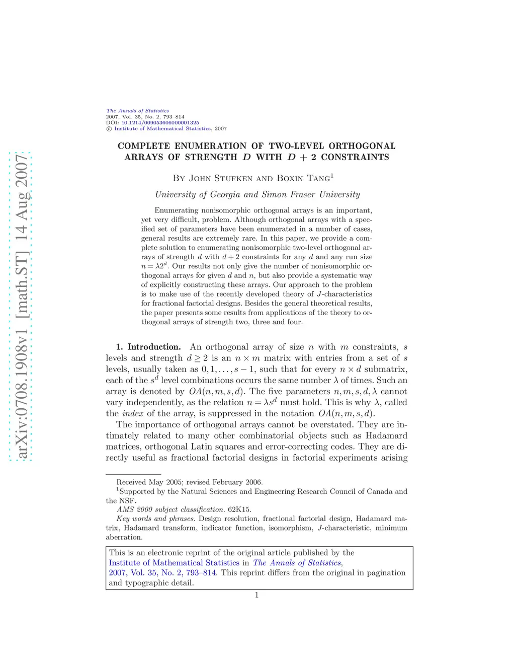 Enumerating nonisomorphic orthogonal arrays is an important, yet very difficult, problem. Although orthogonal arrays with a specified set of parameters have been enumerated in a number of cases, general results are extremely rare. In this paper, we provide a complete solution to enumerating nonisomorphic two-level orthogonal arrays of strength with constraints for any and any run size . Our results not only give the number of nonisomorphic orthogonal arrays for given and , but also provide a systematic way of explicitly constructing these arrays. Our approach to the problem is to make use of the recently developed theory of -characteristics for fractional factorial designs. Besides the general theoretical results, the paper presents some results from applications of the theory to orthogonal arrays of strength two, three and four.