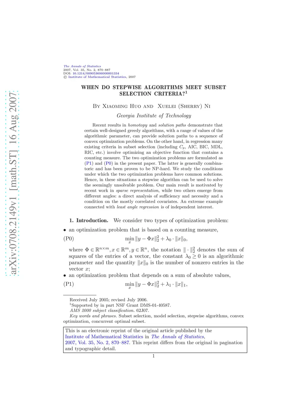 Recent results in homotopy and solution paths demonstrate that certain well-designed greedy algorithms, with a range of values of the algorithmic parameter, can provide solution paths to a sequence of convex optimization problems. On the other hand, in regression many existing criteria in subset selection (including , AIC, BIC, MDL, RIC, etc.) involve optimizing an objective function that contains a counting measure. The two optimization problems are formulated as (P1) and (P0) in the present paper. The latter is generally combinatoric and has been proven to be NP-hard. We study the conditions under which the two optimization problems have common solutions. Hence, in these situations a stepwise algorithm can be used to solve the seemingly unsolvable problem. Our main result is motivated by recent work in sparse representation, while two others emerge from different angles: a direct analysis of sufficiency and necessity and a condition on the mostly correlated covariates. An extreme example connected with least angle regression is of independent interest.