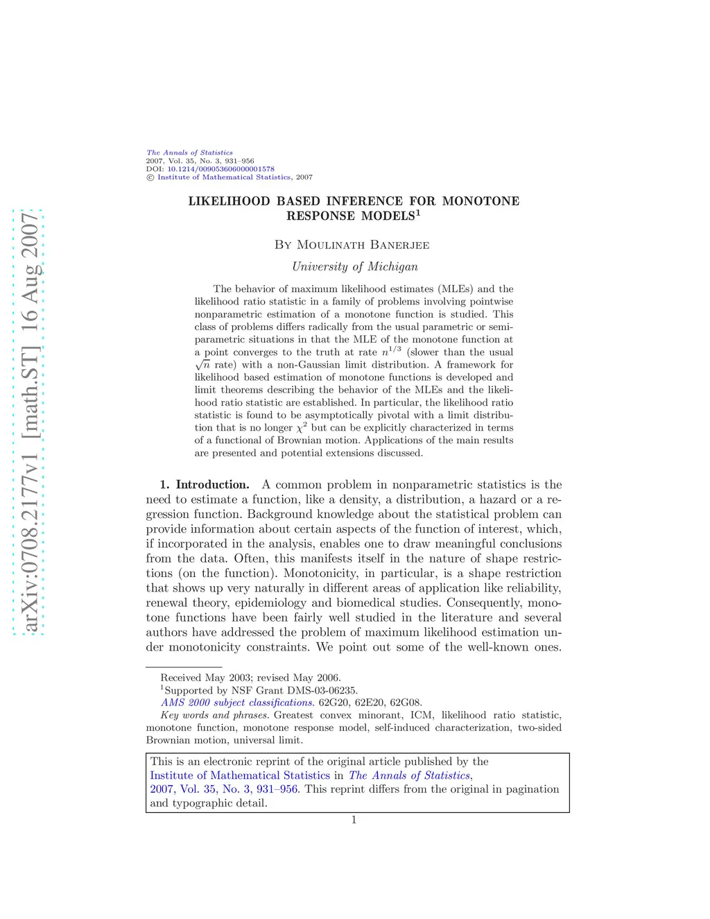 The behavior of maximum likelihood estimates (MLEs) and the likelihood ratio statistic in a family of problems involving pointwise nonparametric estimation of a monotone function is studied. This class of problems differs radically from the usual parametric or semiparametric situations in that the MLE of the monotone function at a point converges to the truth at rate (slower than the usual rate) with a non-Gaussian limit distribution. A framework for likelihood based estimation of monotone functions is developed and limit theorems describing the behavior of the MLEs and the likelihood ratio statistic are established. In particular, the likelihood ratio statistic is found to be asymptotically pivotal with a limit distribution that is no longer but can be explicitly characterized in terms of a functional of Brownian motion. Applications of the main results are presented and potential extensions discussed.