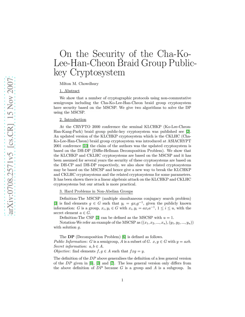 We show that a number of cryptographic protocols using non-commutative semigroups including the Cha-Ko-Lee-Han-Cheon braid group public-key cryptosystem and related public-key cryptosystems such as the Shpilrain-Ushakov public-key cryptosystems are based on the MSCSP.
