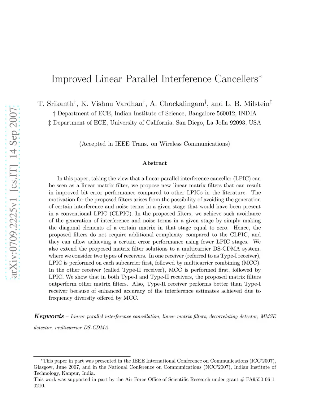 In this paper, taking the view that a linear parallel interference canceller (LPIC) can be seen as a linear matrix filter, we propose new linear matrix filters that can result in improved bit error performance compared to other LPICs in the literature. The motivation for the proposed filters arises from the possibility of avoiding the generation of certain interference and noise terms in a given stage that would have been present in a conventional LPIC (CLPIC). In the proposed filters, we achieve such avoidance of the generation of interference and noise terms in a given stage by simply making the diagonal elements of a certain matrix in that stage equal to zero. Hence, the proposed filters do not require additional complexity compared to the CLPIC, and they can allow achieving a certain error performance using fewer LPIC stages. We also extend the proposed matrix filter solutions to a multicarrier DS-CDMA system, where we consider two types of receivers. In one receiver (referred to as Type-I receiver), LPIC is performed on each subcarrier first, followed by multicarrier combining (MCC). In the other receiver (called Type-II receiver), MCC is performed first, followed by LPIC. We show that in both Type-I and Type-II receivers, the proposed matrix filters outperform other matrix filters. Also, Type-II receiver performs better than Type-I receiver because of enhanced accuracy of the interference estimates achieved due to frequency diversity offered by MCC.