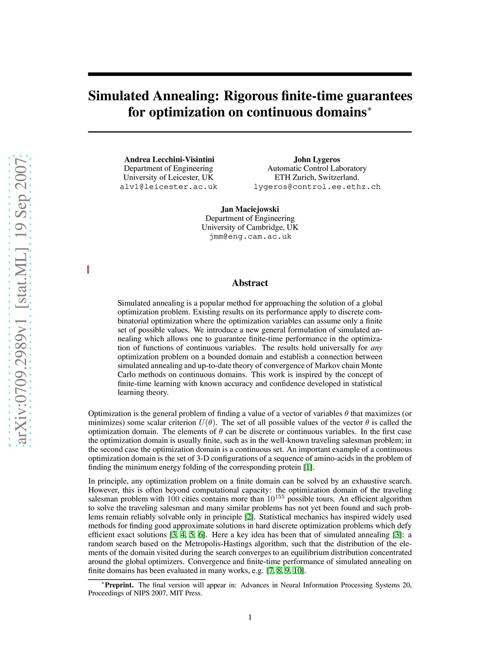 Simulated annealing is a popular method for approaching the solution of a global optimization problem. Existing results on its performance apply to discrete combinatorial optimization where the optimization variables can assume only a finite set of possible values. We introduce a new general formulation of simulated annealing which allows one to guarantee finite-time performance in the optimization of functions of continuous variables. The results hold universally for any optimization problem on a bounded domain and establish a connection between simulated annealing and up-to-date theory of convergence of Markov chain Monte Carlo methods on continuous domains. This work is inspired by the concept of finite-time learning with known accuracy and confidence developed in statistical learning theory.