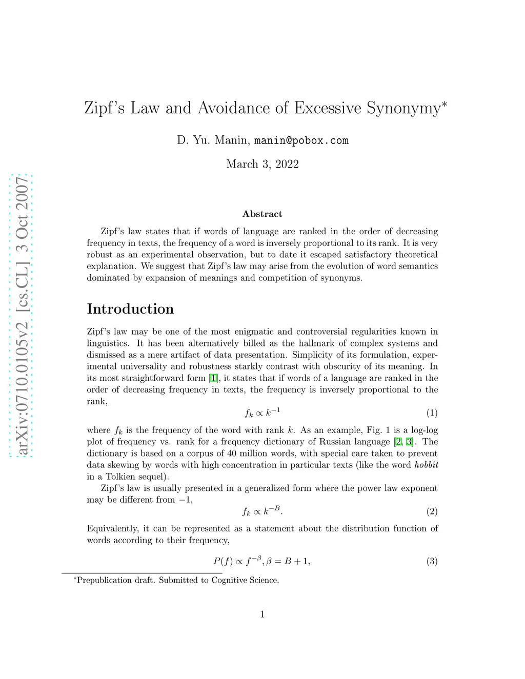 Zipf's law states that if words of language are ranked in the order of decreasing frequency in texts, the frequency of a word is inversely proportional to its rank. It is very robust as an experimental observation, but to date it escaped satisfactory theoretical explanation. We suggest that Zipf's law may arise from the evolution of word semantics dominated by expansion of meanings and competition of synonyms.