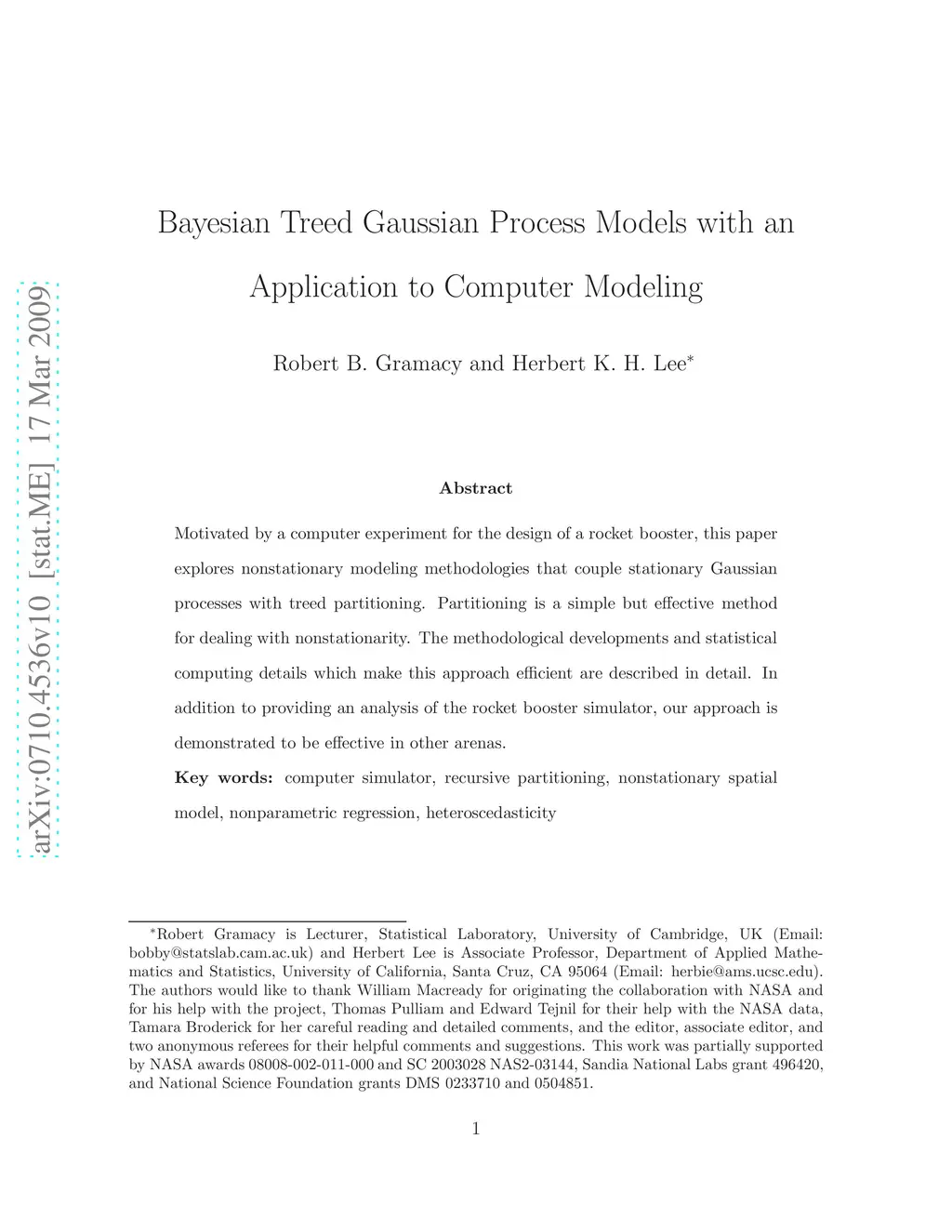 Motivated by a computer experiment for the design of a rocket booster, this paper explores nonstationary modeling methodologies that couple stationary Gaussian processes with treed partitioning. Partitioning is a simple but effective method for dealing with nonstationarity. The methodological developments and statistical computing details which make this approach efficient are described in detail. In addition to providing an analysis of the rocket booster simulator, our approach is demonstrated to be effective in other arenas.