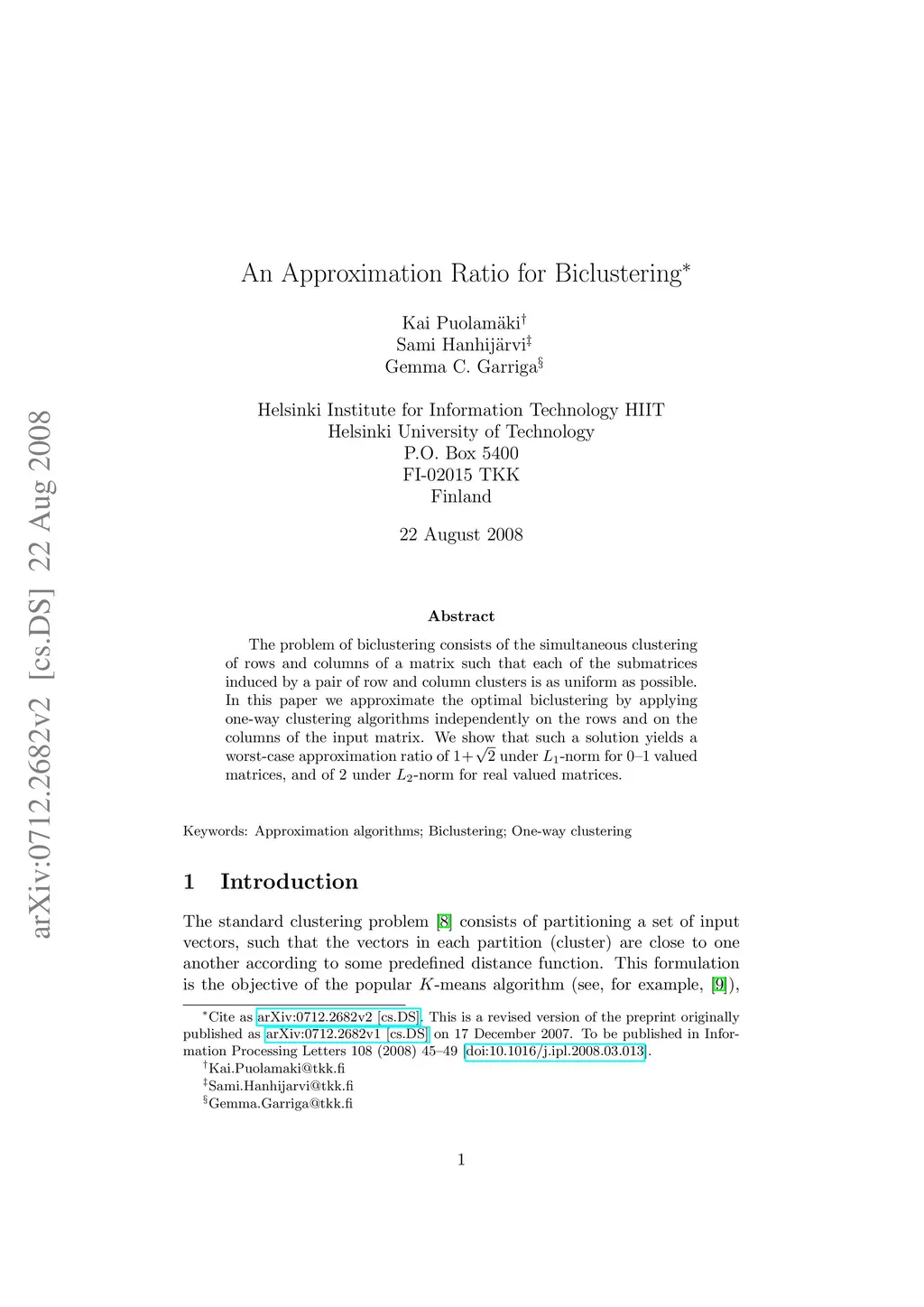 The problem of biclustering consists of the simultaneous clustering of rows and columns of a matrix such that each of the submatrices induced by a pair of row and column clusters is as uniform as possible. In this paper we approximate the optimal biclustering by applying one-way clustering algorithms independently on the rows and on the columns of the input matrix. We show that such a solution yields a worst-case approximation ratio of 1+sqrt(2) under L1-norm for 0-1 valued matrices, and of 2 under L2-norm for real valued matrices.