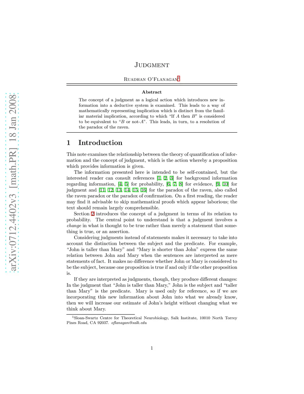 The concept of a judgment as a logical action which introduces new information into a deductive system is examined. This leads to a way of mathematically representing implication which is distinct from the familiar material implication, according to which "If A then B" is considered to be equivalent to "B or not-A". This leads, in turn, to a resolution of the paradox of the raven.