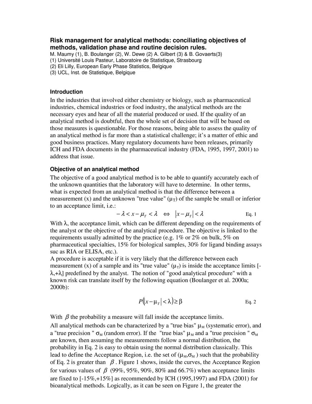 In the industries that involved either chemistry or biology, such as pharmaceutical industries, chemical industries or food industry, the analytical methods are the necessary eyes and hear of all the material produced or used. If the quality of an analytical method is doubtful, then the whole set of decision that will be based on those measures is questionable. For those reasons, being able to assess the quality of an analytical method is far more than a statistical challenge; it's a matter of ethic and good business practices. Many regulatory documents have been releases, primarily ICH and FDA documents in the pharmaceutical industry (FDA, 1995, 1997, 2001) to address that issue.