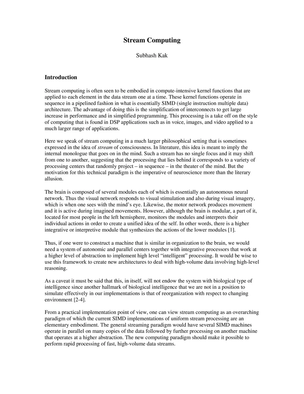 Stream computing is the use of multiple autonomic and parallel modules together with integrative processors at a higher level of abstraction to embody "intelligent" processing. The biological basis of this computing is sketched and the matter of learning is examined.