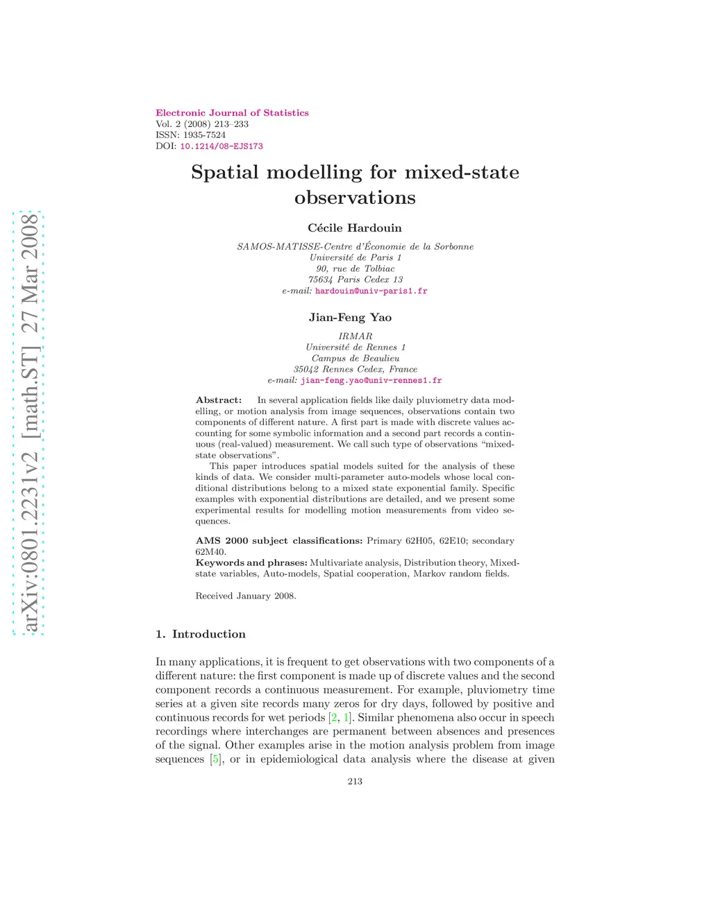 In several application fields like daily pluviometry data modelling, or motion analysis from image sequences, observations contain two components of different nature. A first part is made with discrete values accounting for some symbolic information and a second part records a continuous (real-valued) measurement. We call such type of observations "mixed-state observations". This paper introduces spatial models suited for the analysis of these kinds of data. We consider multi-parameter auto-models whose local conditional distributions belong to a mixed state exponential family. Specific examples with exponential distributions are detailed, and we present some experimental results for modelling motion measurements from video sequences.