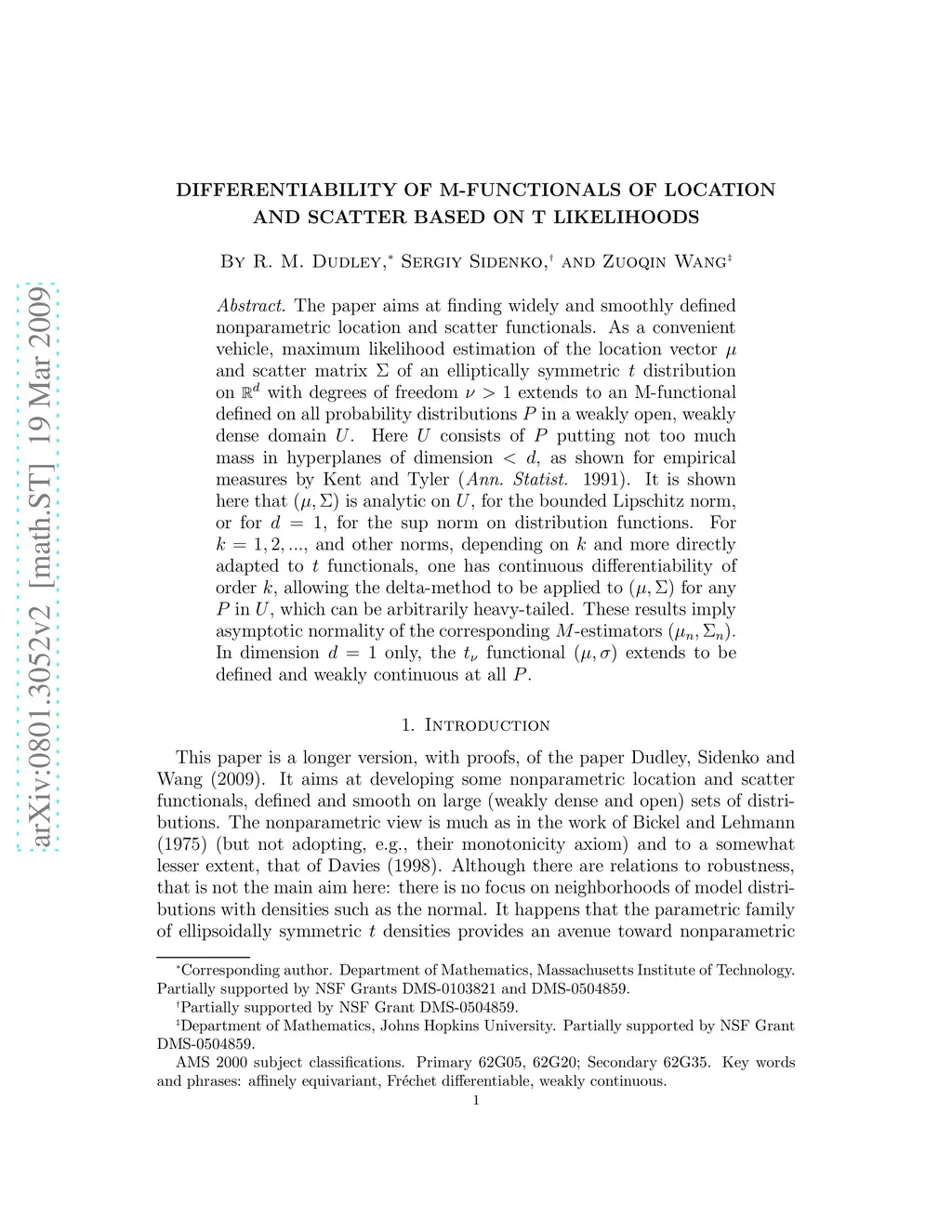 The paper aims at finding widely and smoothly defined nonparametric location and scatter functionals. As a convenient vehicle, maximum likelihood estimation of the location vector m and scatter matrix S of an elliptically symmetric t distribution on d-dimensional space with degrees of freedom larger than 1 extends to an M-functional defined on all probability distributions P in a weakly open, weakly dense domain U. Here U consists of P not putting too much mass in hyperplanes of dimension < d, as shown for empirical measures by Kent and Tyler, Ann. Statist. 1991. It is shown here that (m,S) is analytic on U, for the bounded Lipschitz norm, or for d=1, for the sup norm on distribution functions. For k=1,2,..., and other norms, depending on k and more directly adapted to t functionals, one has continuous differentiability of order k, allowing the delta-method to be applied to (m,S) for any P in U, which can be arbitrarily heavy-tailed. These results imply asymptotic normality of the corresponding M-estimators (m_n,S_n). In dimension d=1 only, the t functionals extend to be defined and weakly continuous at all t.