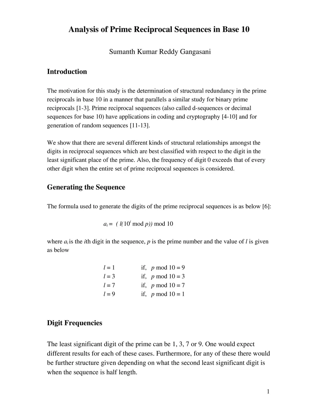 Analysis of Prime Reciprocal Sequences in Base 10
