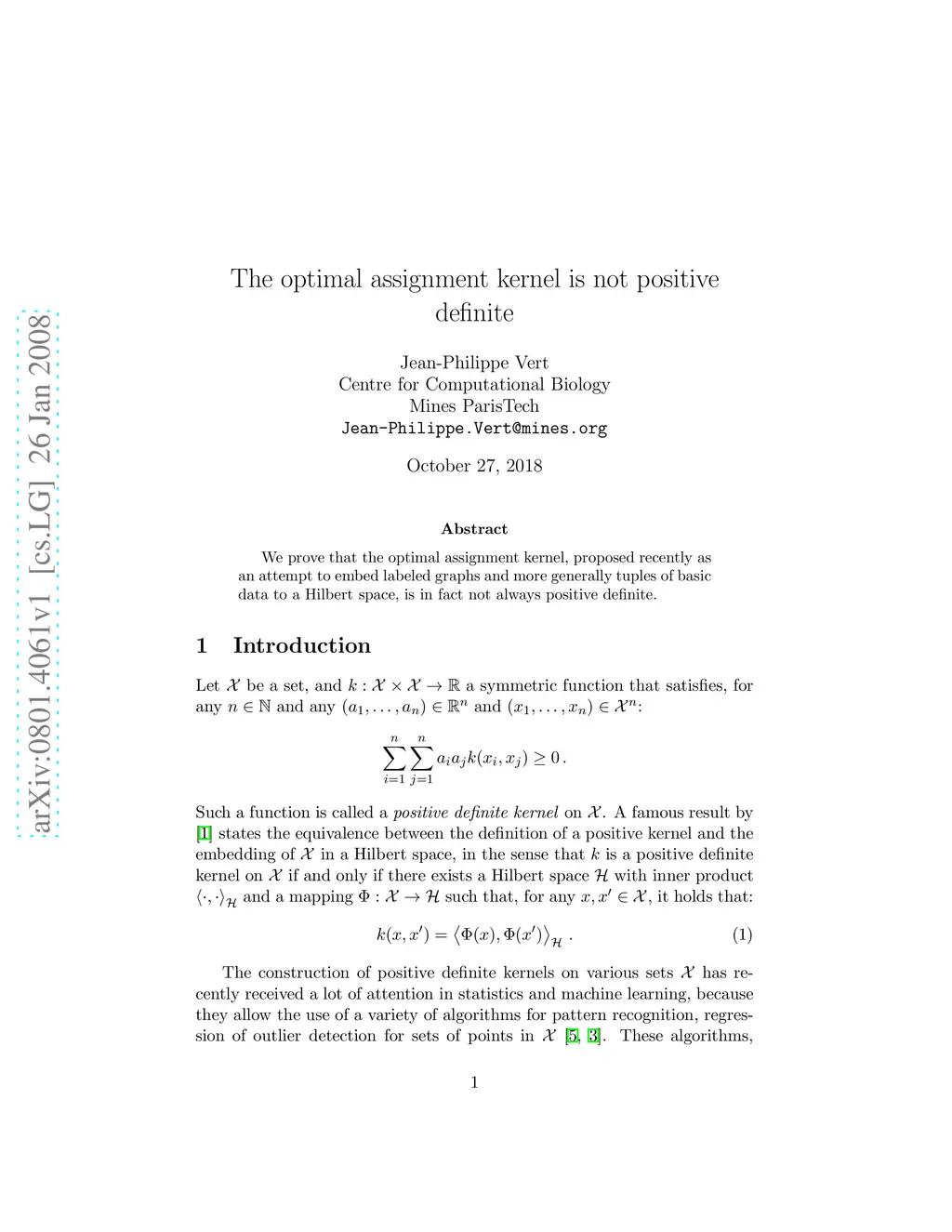 We prove that the optimal assignment kernel, proposed recently as an attempt to embed labeled graphs and more generally tuples of basic data to a Hilbert space, is in fact not always positive definite.