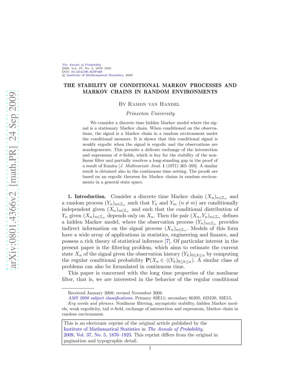 We consider a discrete time hidden Markov model where the signal is a stationary Markov chain. When conditioned on the observations, the signal is a Markov chain in a random environment under the conditional measure. It is shown that this conditional signal is weakly ergodic when the signal is ergodic and the observations are nondegenerate. This permits a delicate exchange of the intersection and supremum of -fields, which is key for the stability of the nonlinear filter and partially resolves a long-standing gap in the proof of a result of Kunita [J. Multivariate Anal. 1 (1971) 365--393]. A similar result is obtained also in the continuous time setting. The proofs are based on an ergodic theorem for Markov chains in random environments in a general state space.