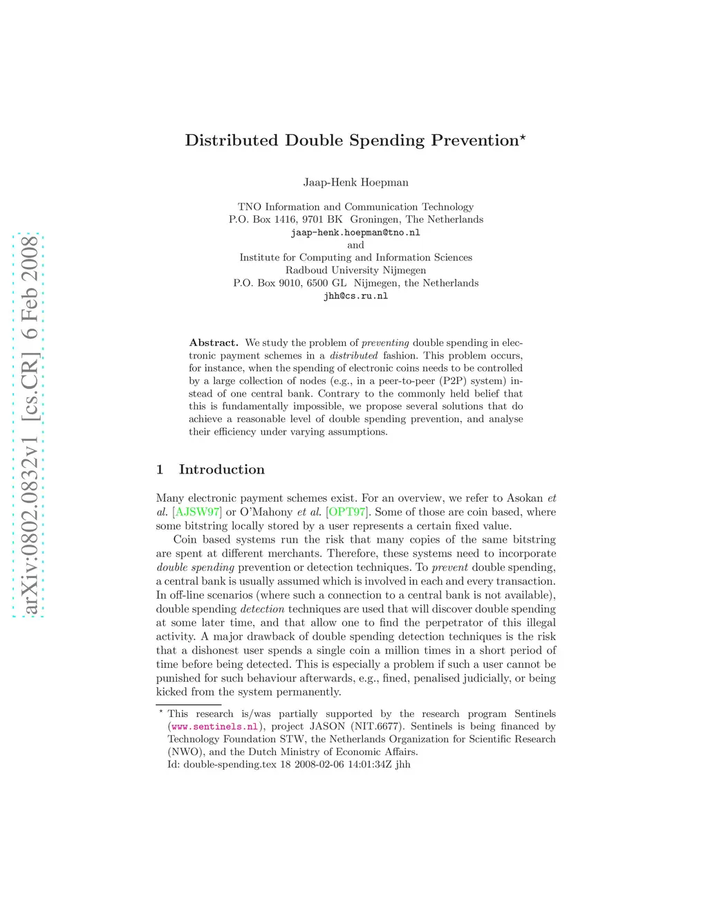 Distributed Double Spending Prevention